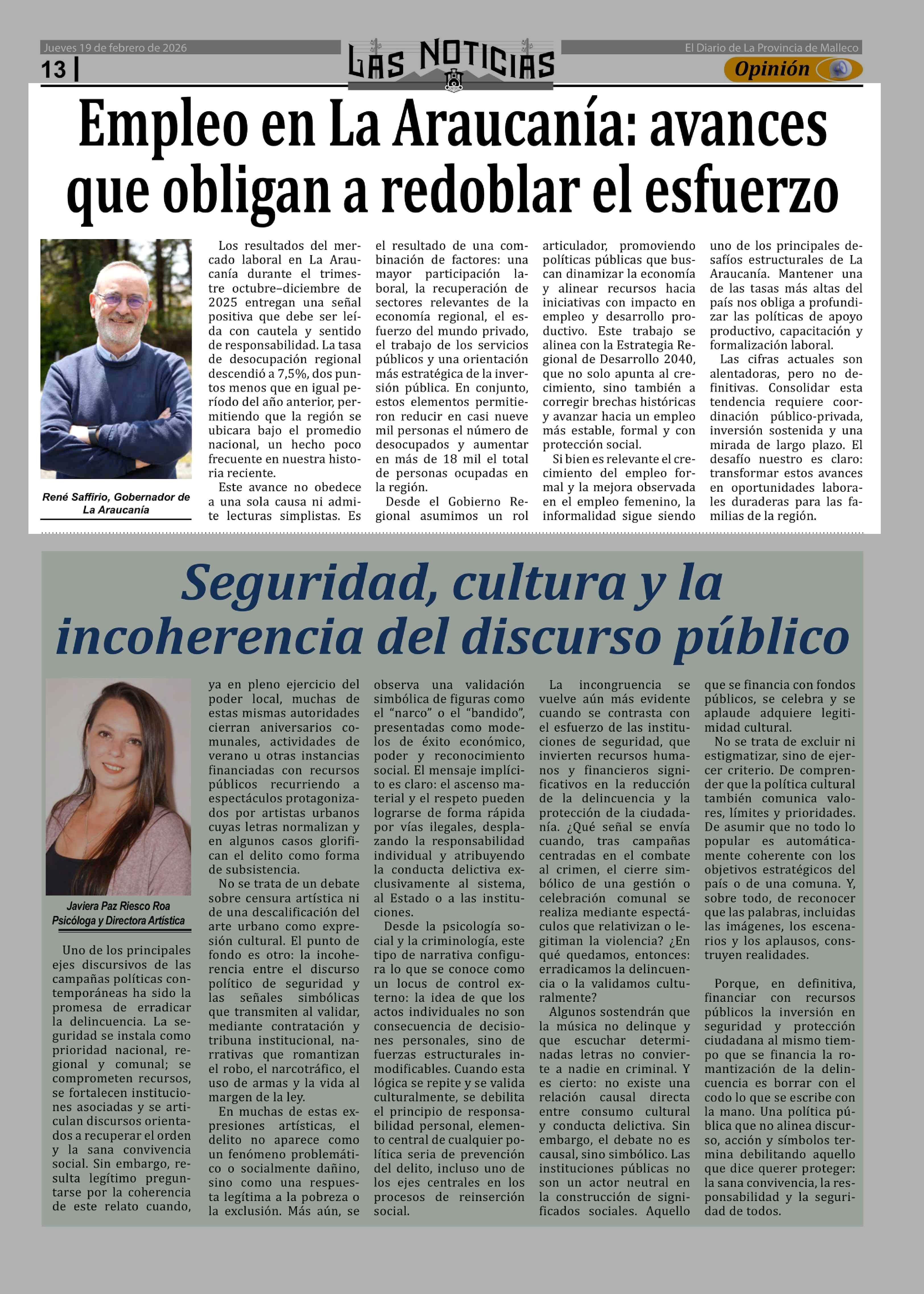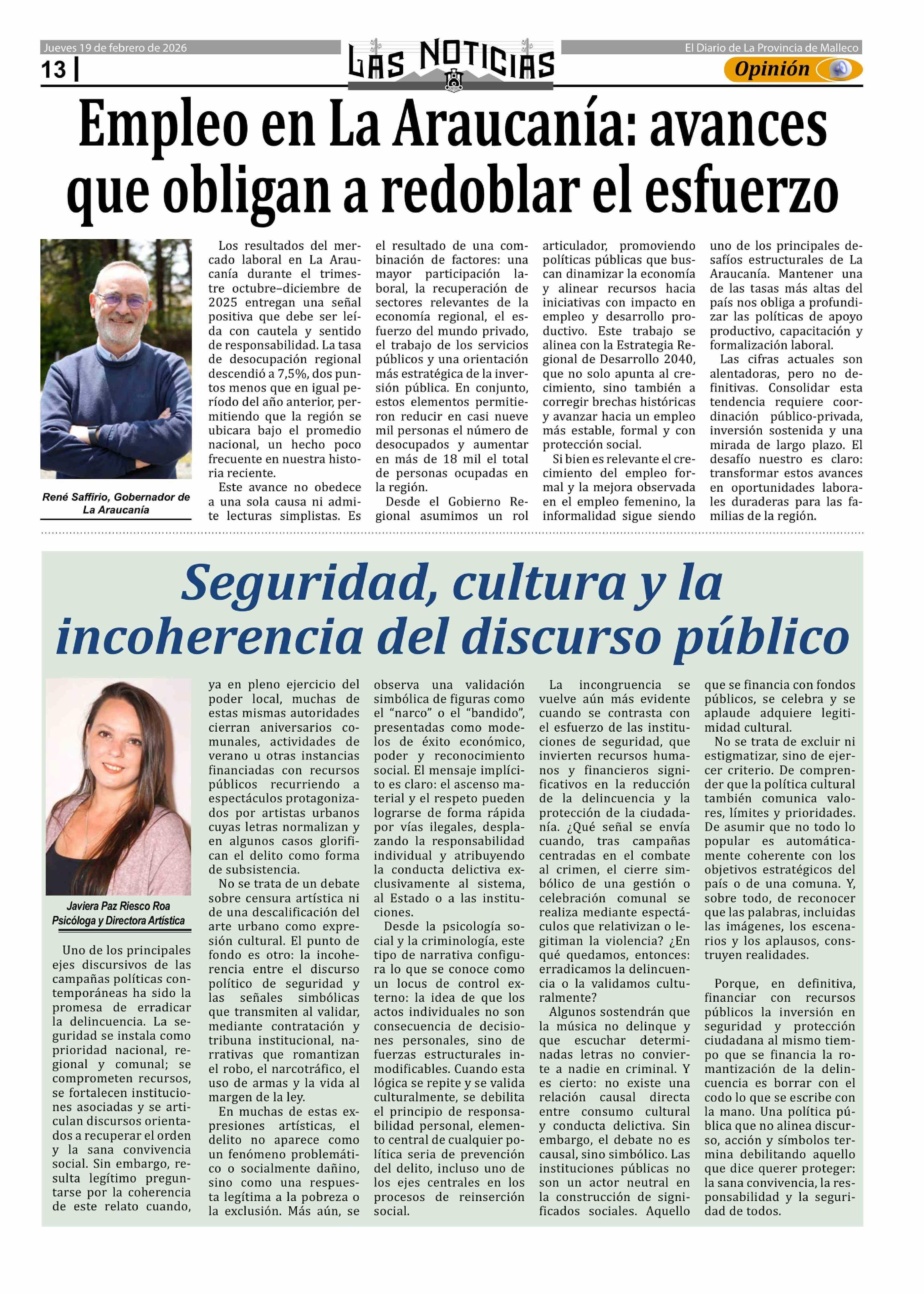 Columnas de Opinión: Empleo en La Araucania: avances que obligan a redoblar el esfuerzo 19-02-2026 Las Noticias |