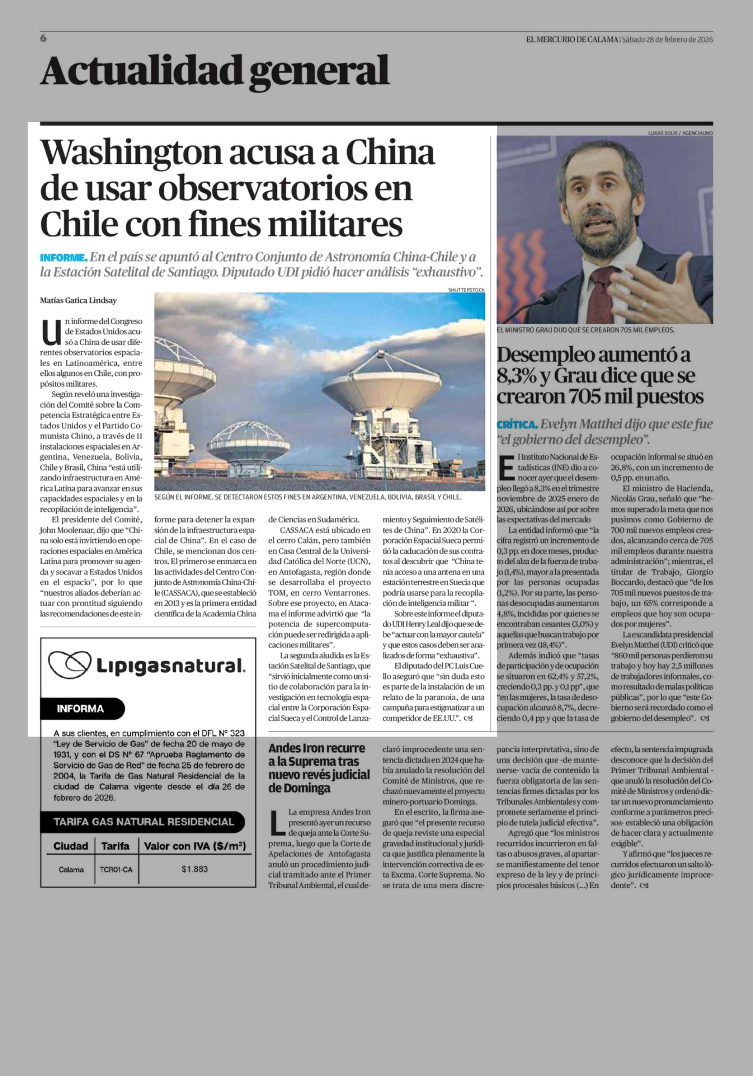 Washington acusa a China de usar observatorios en Chile con fines militares 28-02-2026 El Mercurio de Calama |