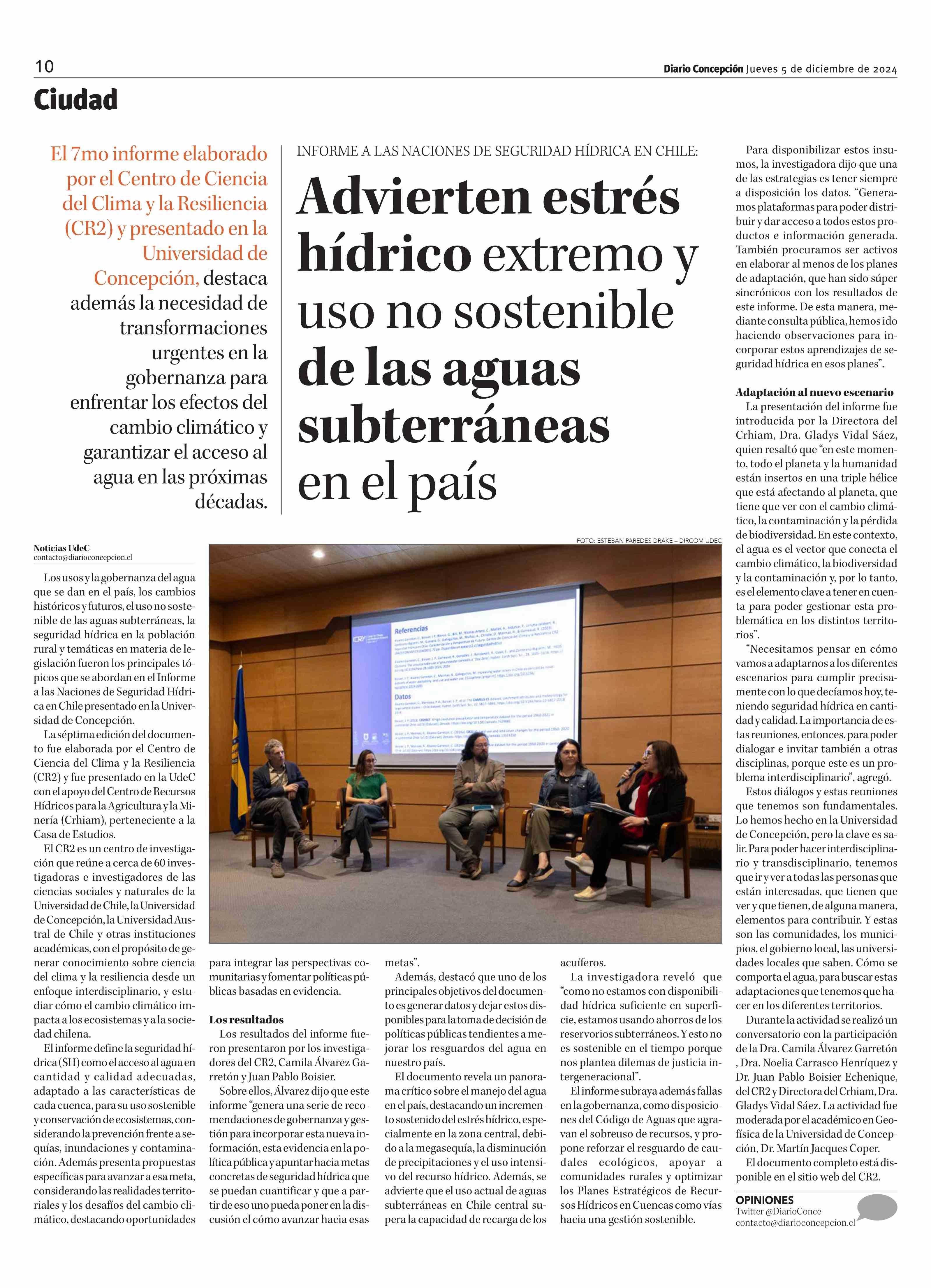 Advierten estrés hídrico extremo y uso no sostenible de las aguas subterráneas en el país 05-12-2024 Diario Concepción |