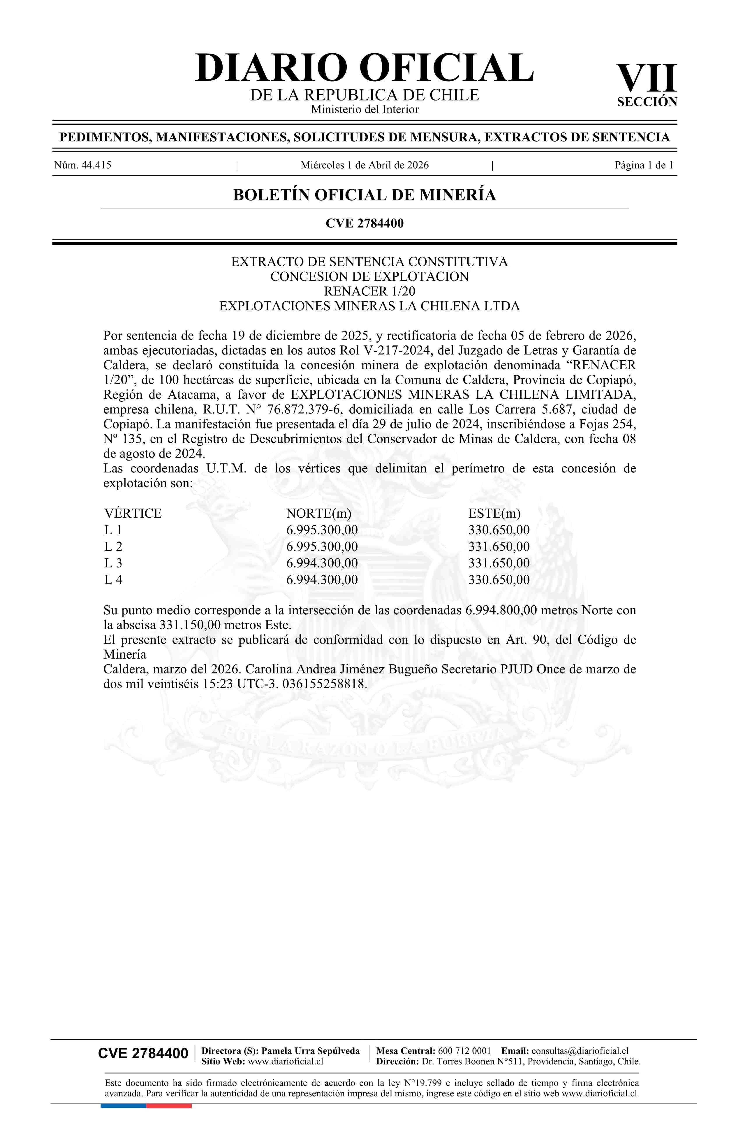 RENACER 1/20 / Explotaciones Mineras La Chilena Limitada 01-04-2026 DIARIO OFICIAL CHILE - BOLETÍN OFICIAL DE MINERÍA |