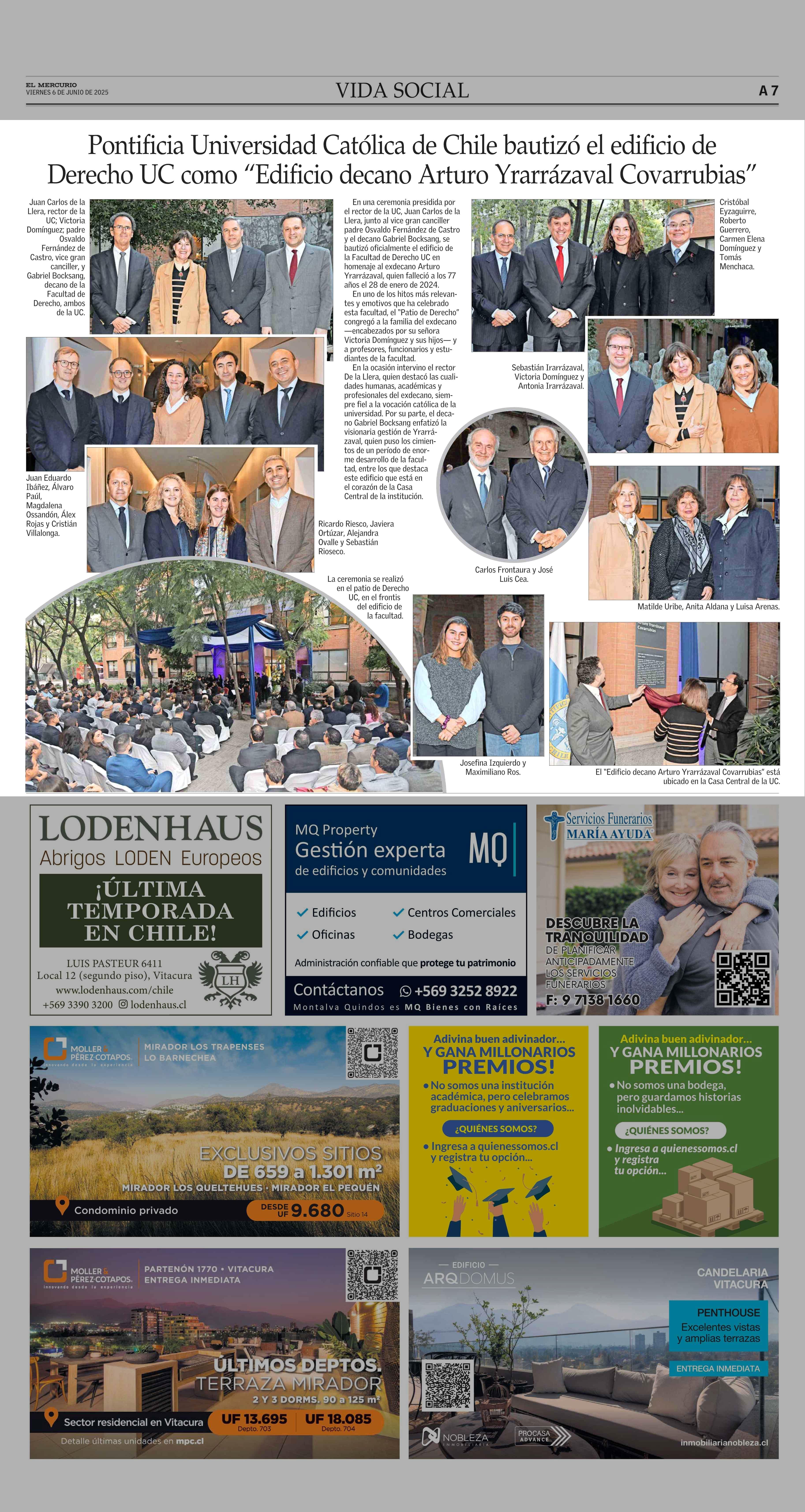 Pontificia Universidad Católica de Chile bautizó el edificio de Derecho UC como “Edificio decano Arturo Yrarrázaval Covarrubias” 06-06-2025 El Mercurio |