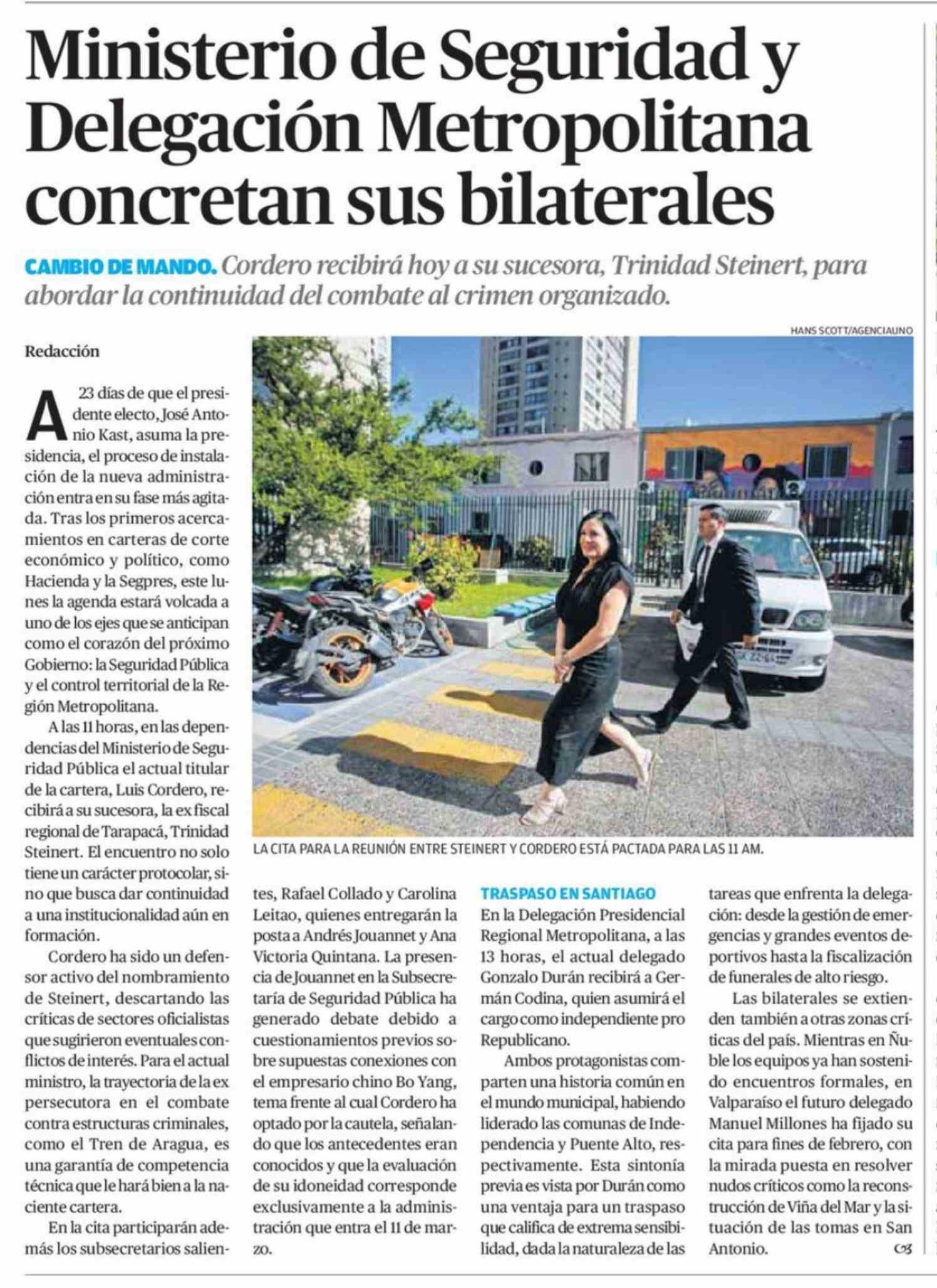 Ministerio de Seguridad y Delegación Metropolitana concretan sus bilaterales 16-02-2026 El Mercurio de Calama |