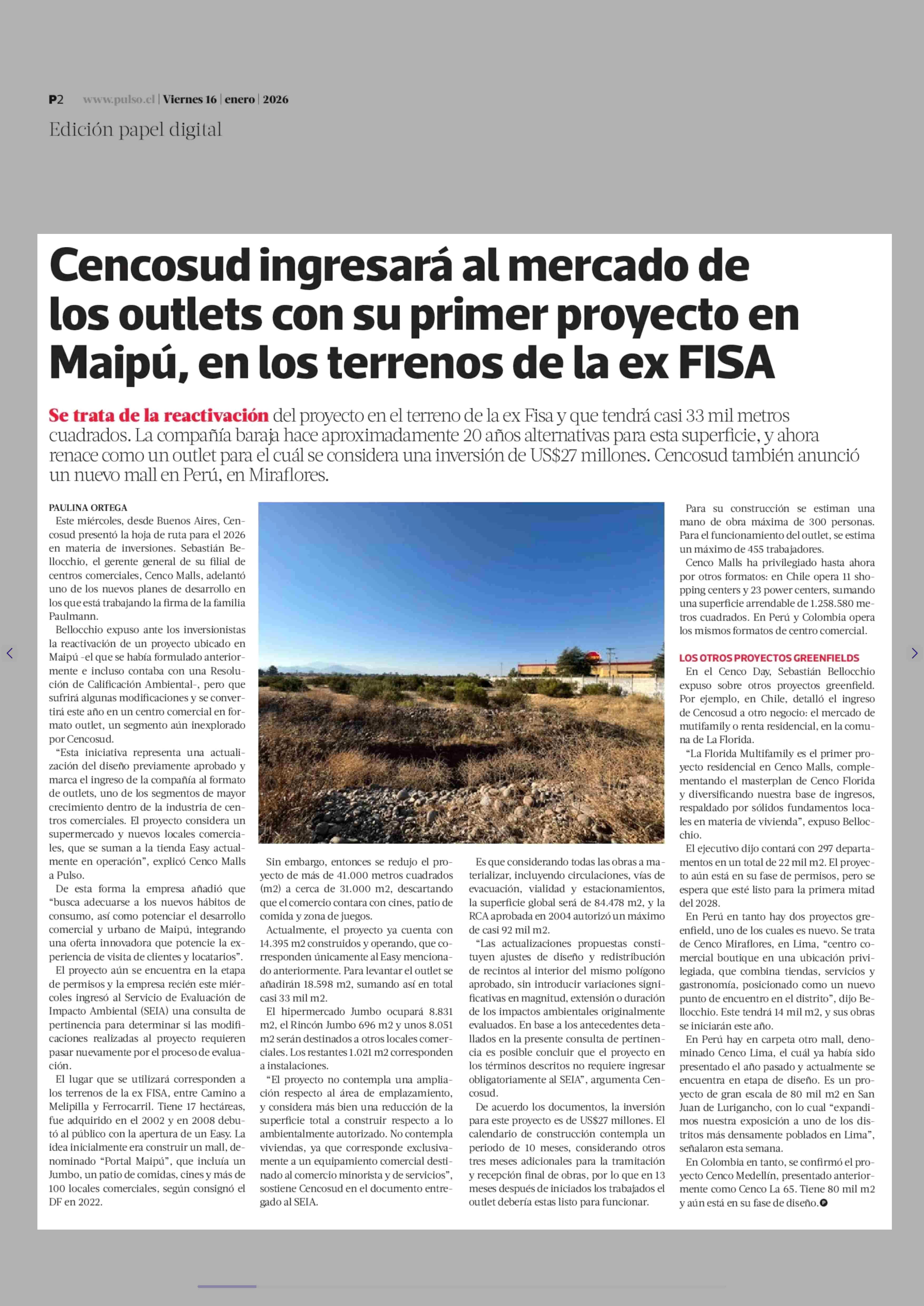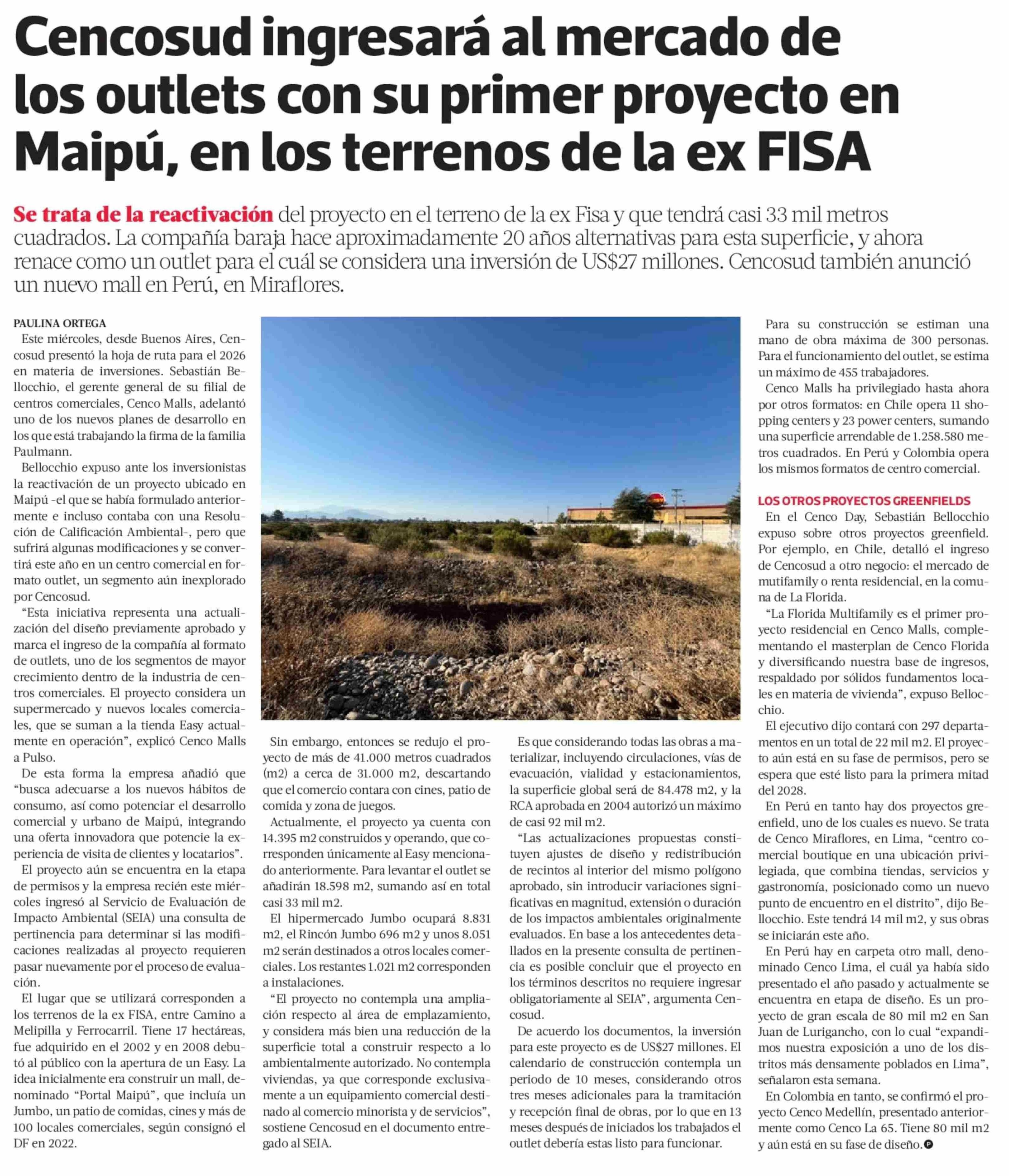 Cencosud ingresará al mercado de los outlets con su primer proyecto en Maipú, en los terrenos de la ex FISA 16-01-2026 La Tercera |