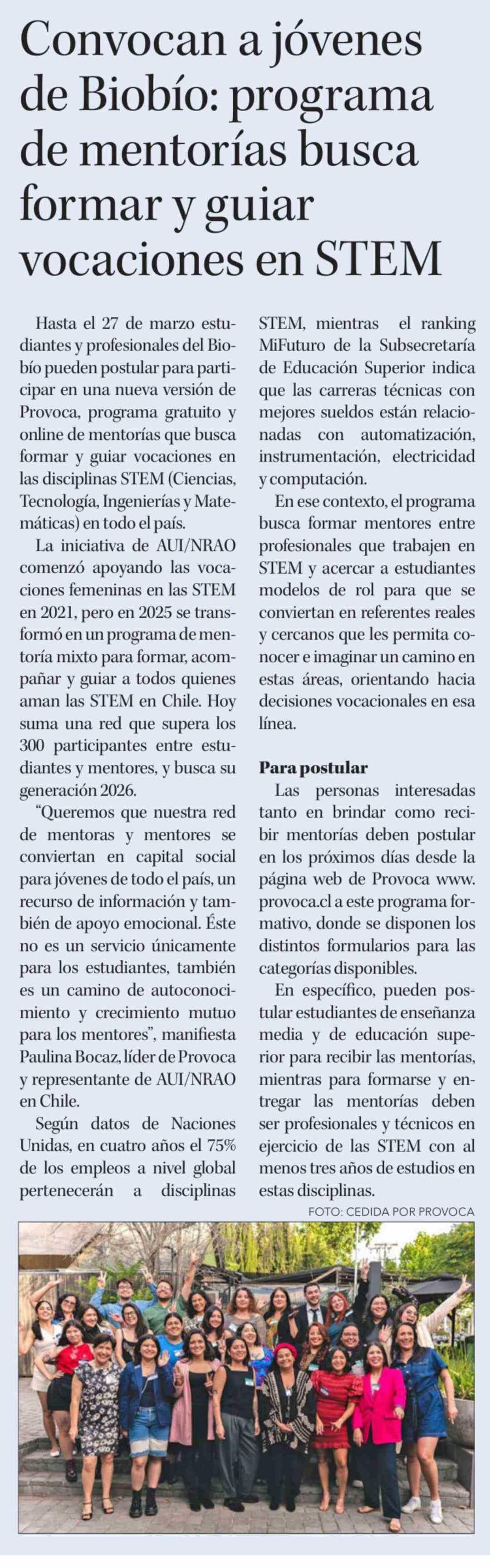 Convocan a jóvenes de Biobío: programa de mentorías busca formar y guiar vocaciones en STEM 21-03-2026 Diario Concepción |