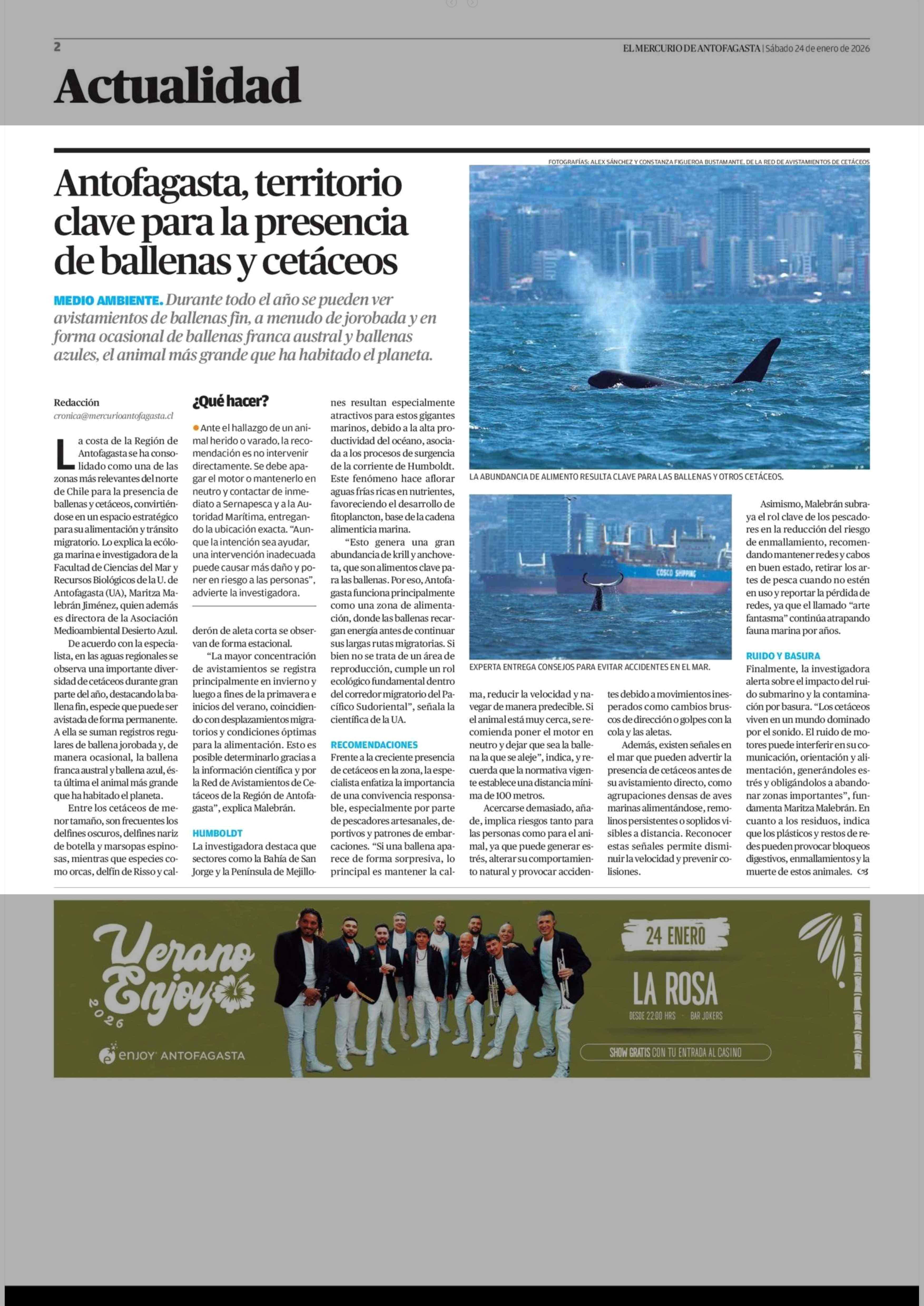 Antofagasta, territorio clave para la presencia de ballenas y cetáceos 24-01-2026 El Mercurio de Antofagasta |