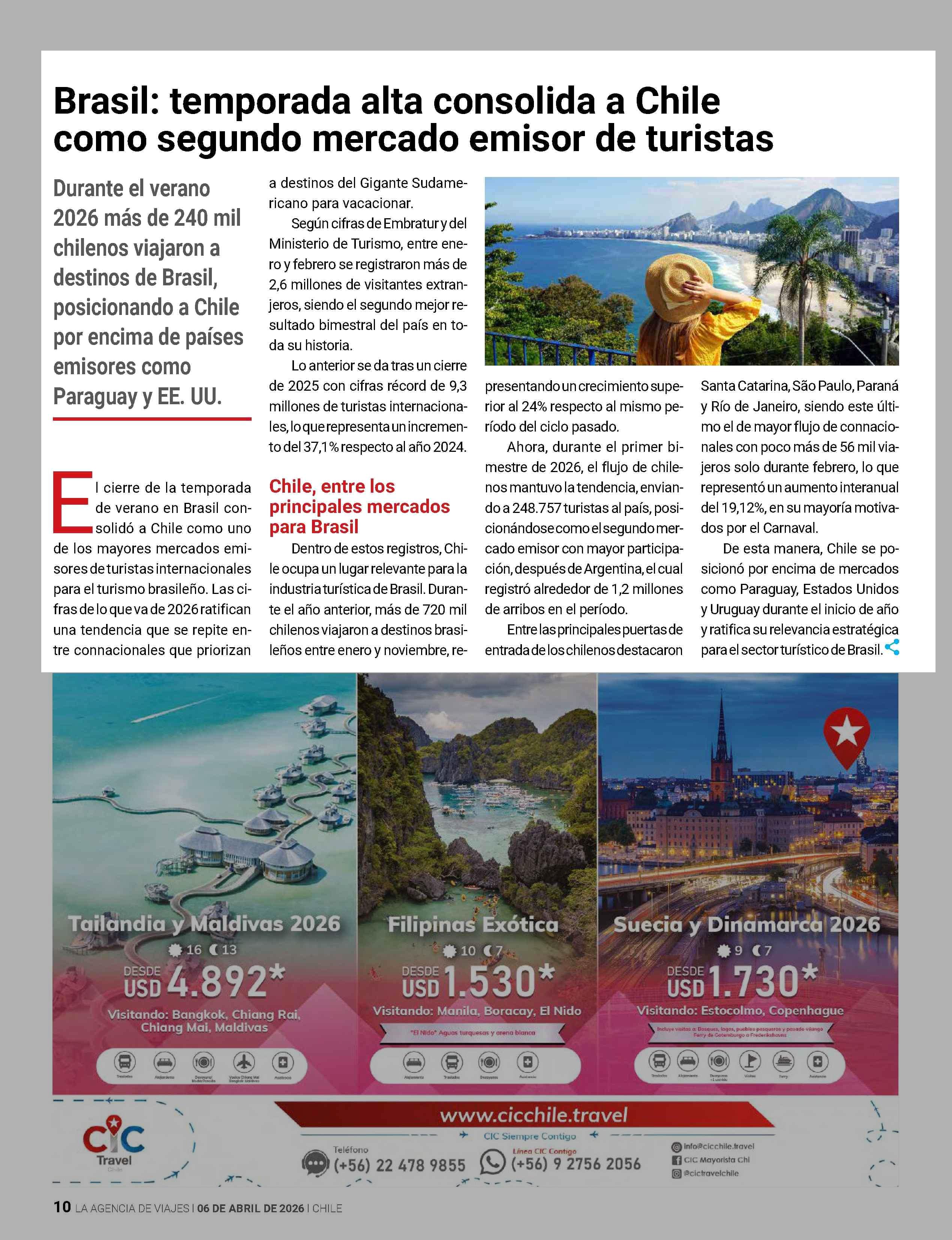 Brasil: temporada alta consolida a Chile como segundo mercado emisor de turistas 13-04-2026 Revista La Agencia de Viajes |