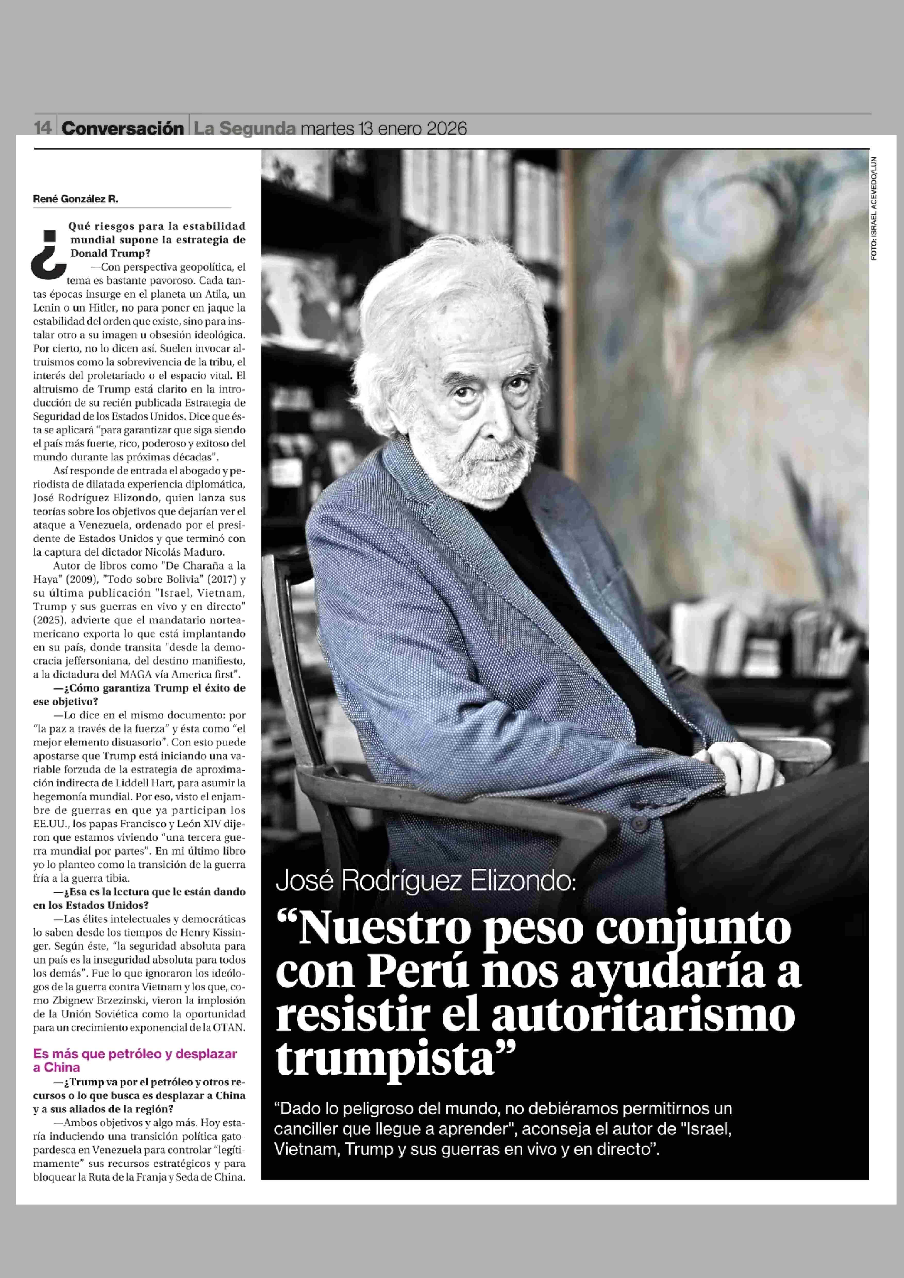 José Rodríguez Elizondo: "Nuestro peso conjunto con Perú nos ayudaría a resistir el autoritarismo trumpista" 13-01-2026 La Segunda |