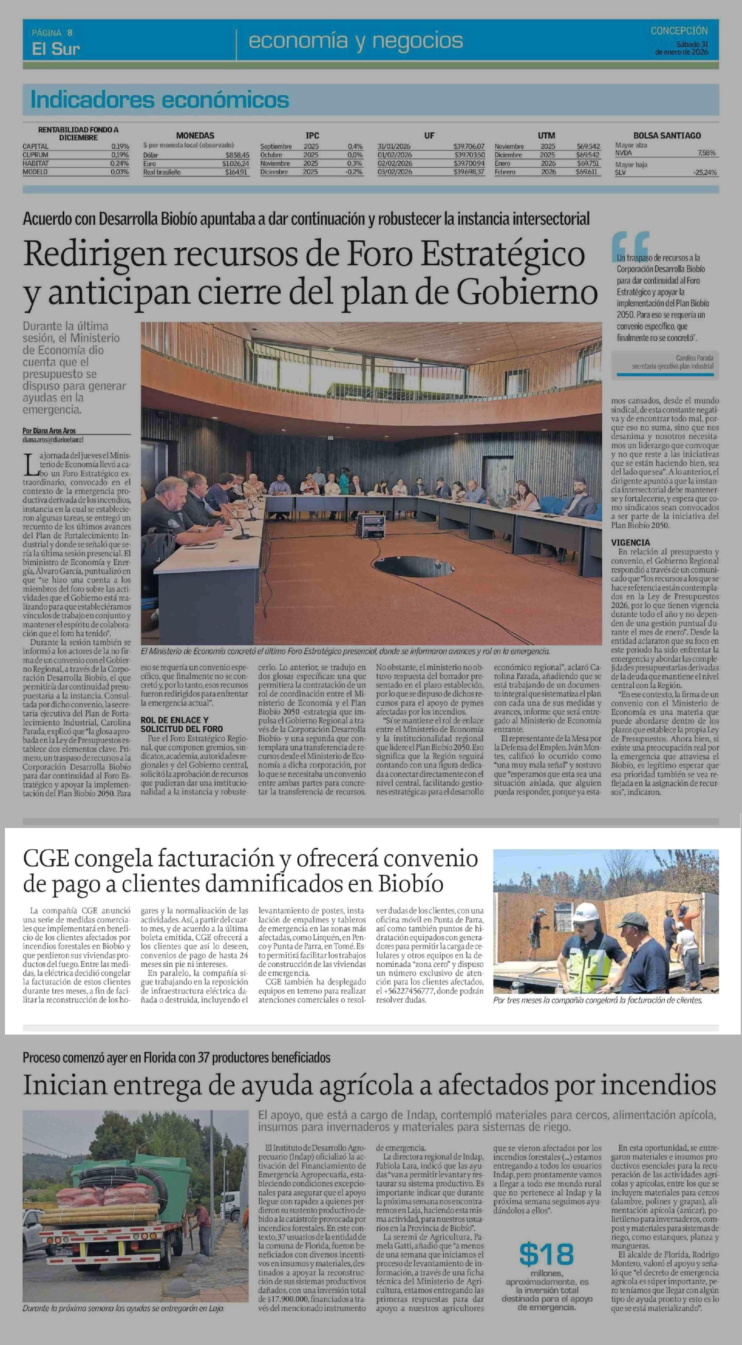 CGE congela facturación y ofrecerá convenio de pago a clientes damnificados en Biobío 31-01-2026 El Sur |