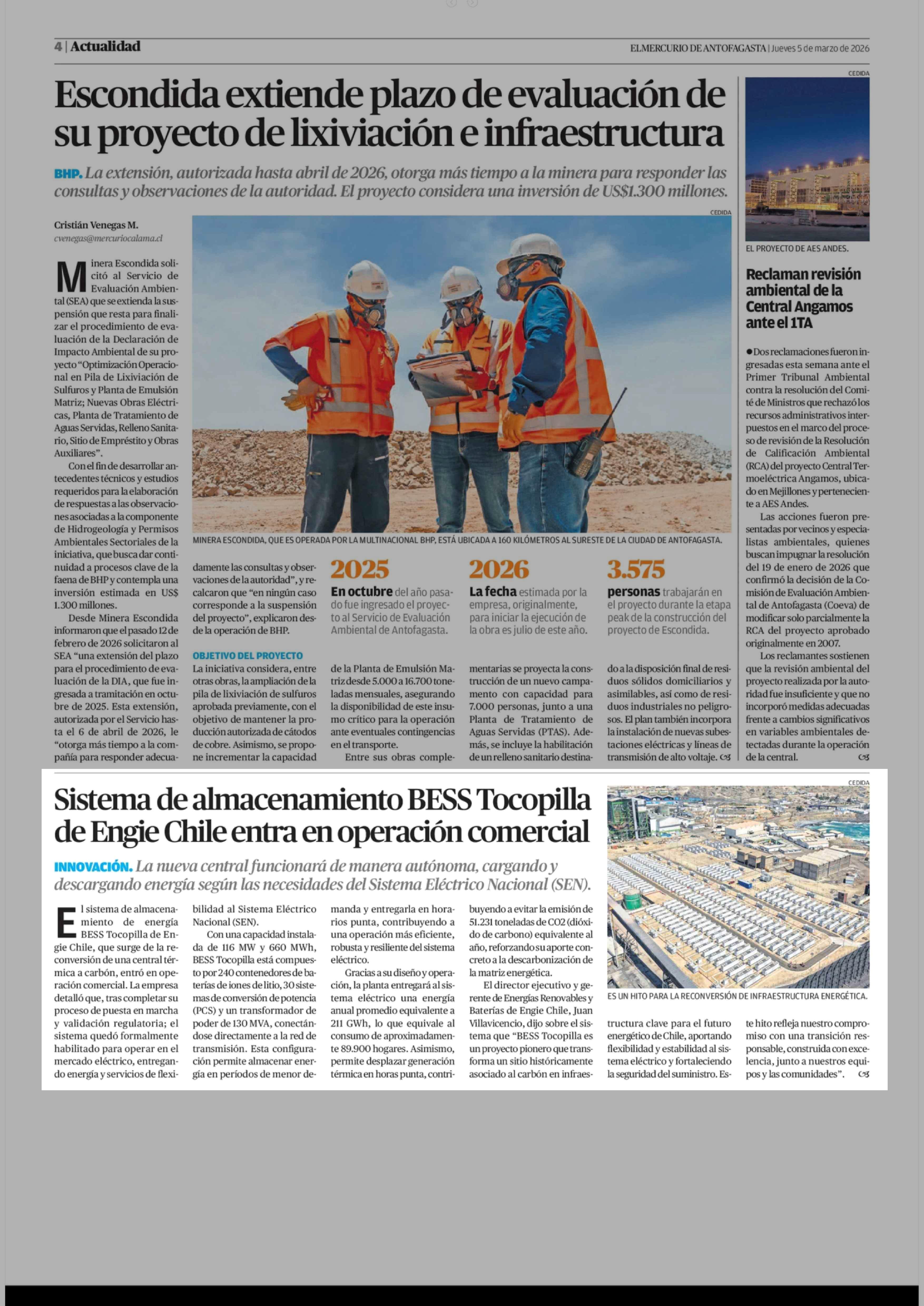 Sistema de almacenamiento BESS Tocopilla de Engie Chile entra en operación comercial 05-03-2026 El Mercurio de Antofagasta |