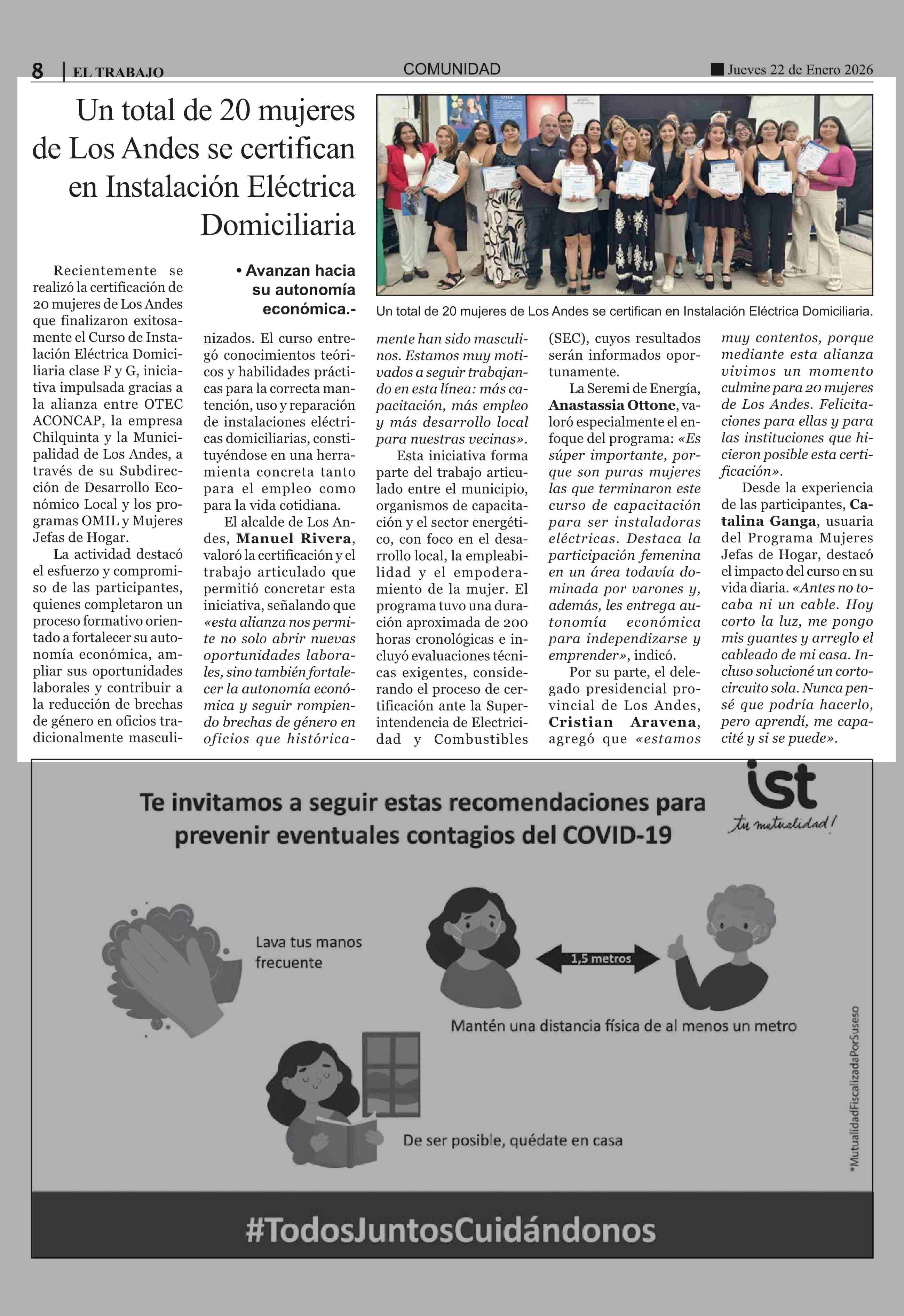 Un total de 20 mujeres de Los Andes se certifican en Instalación Eléctrica Domiciliaria 22-01-2026 El Trabajo |
