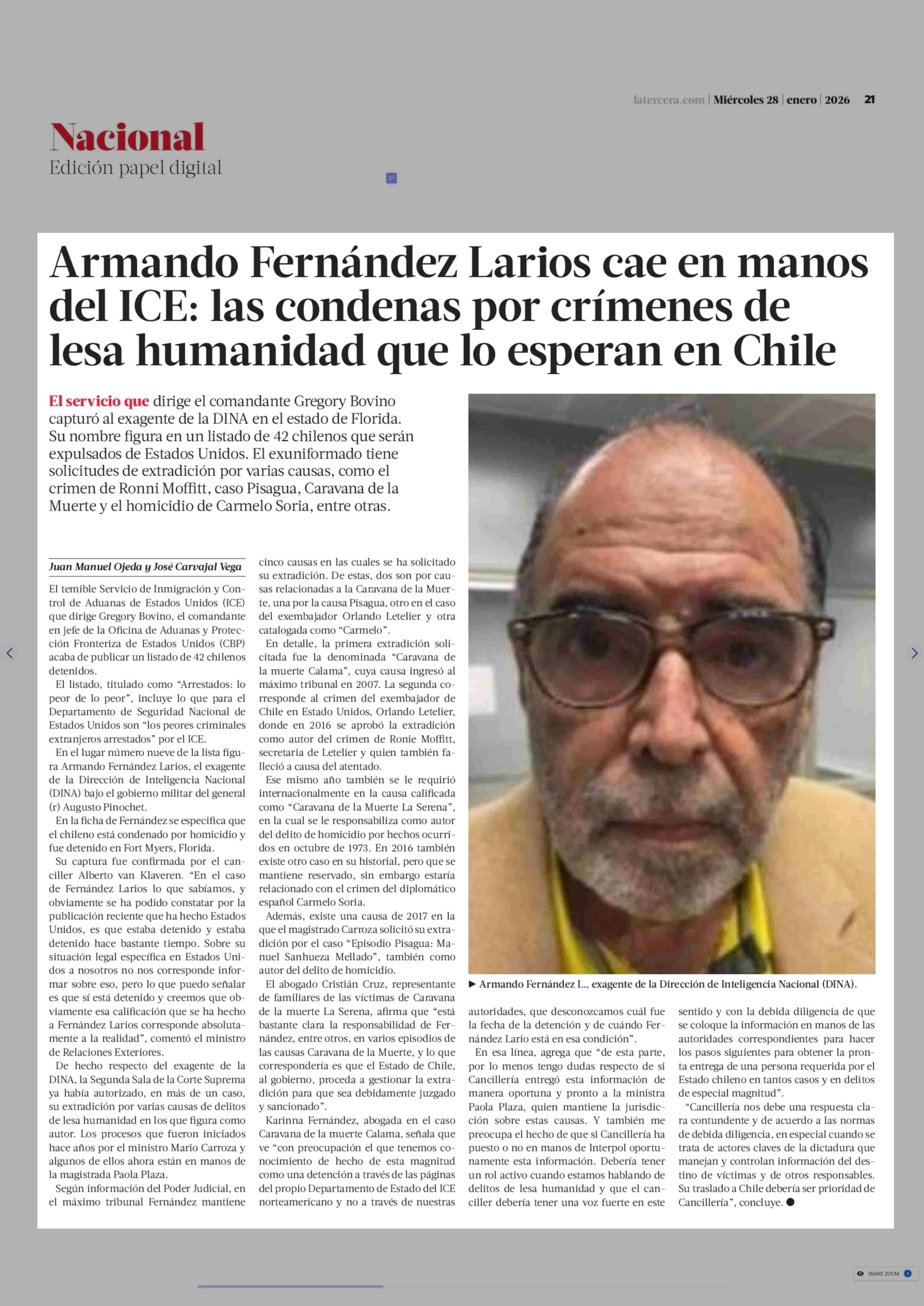 Armando Fernández Larios cae en manos del ICE: las condenas por crímenes de lesa humanidad que lo esperan en Chile 28-01-2026 La Tercera |