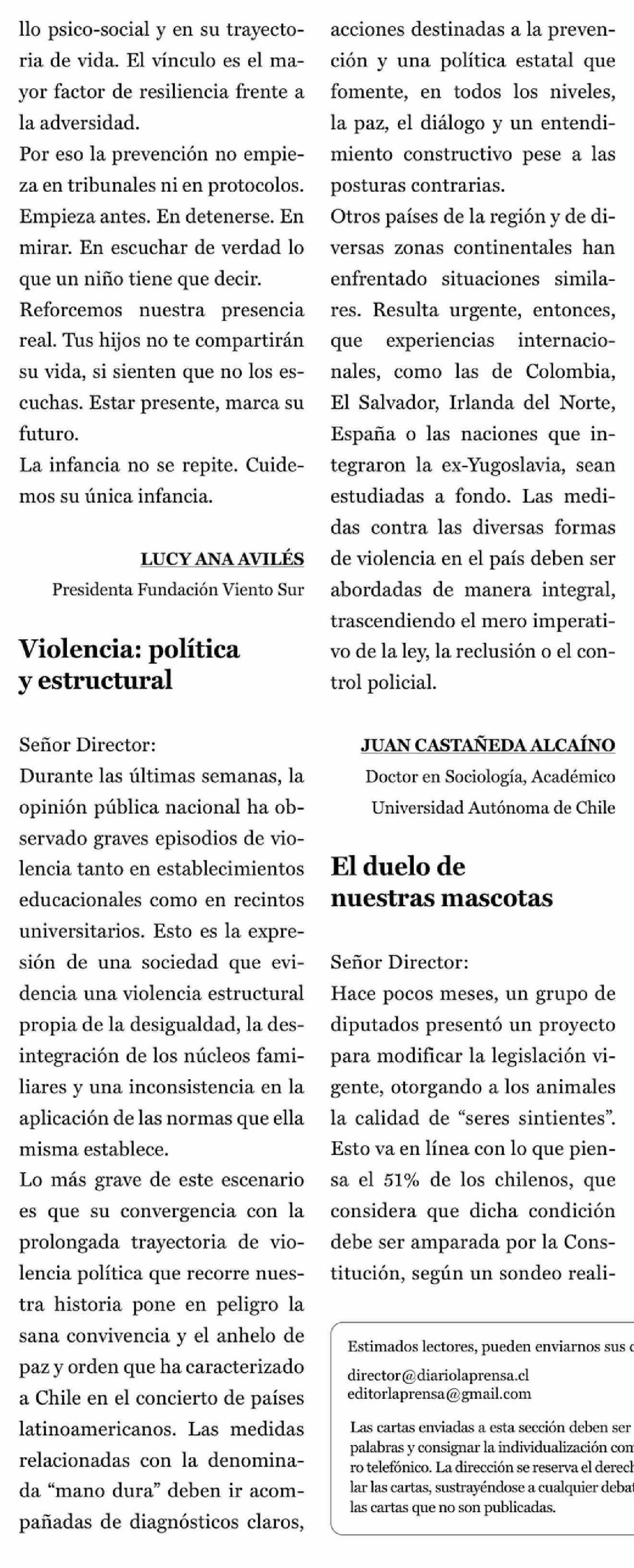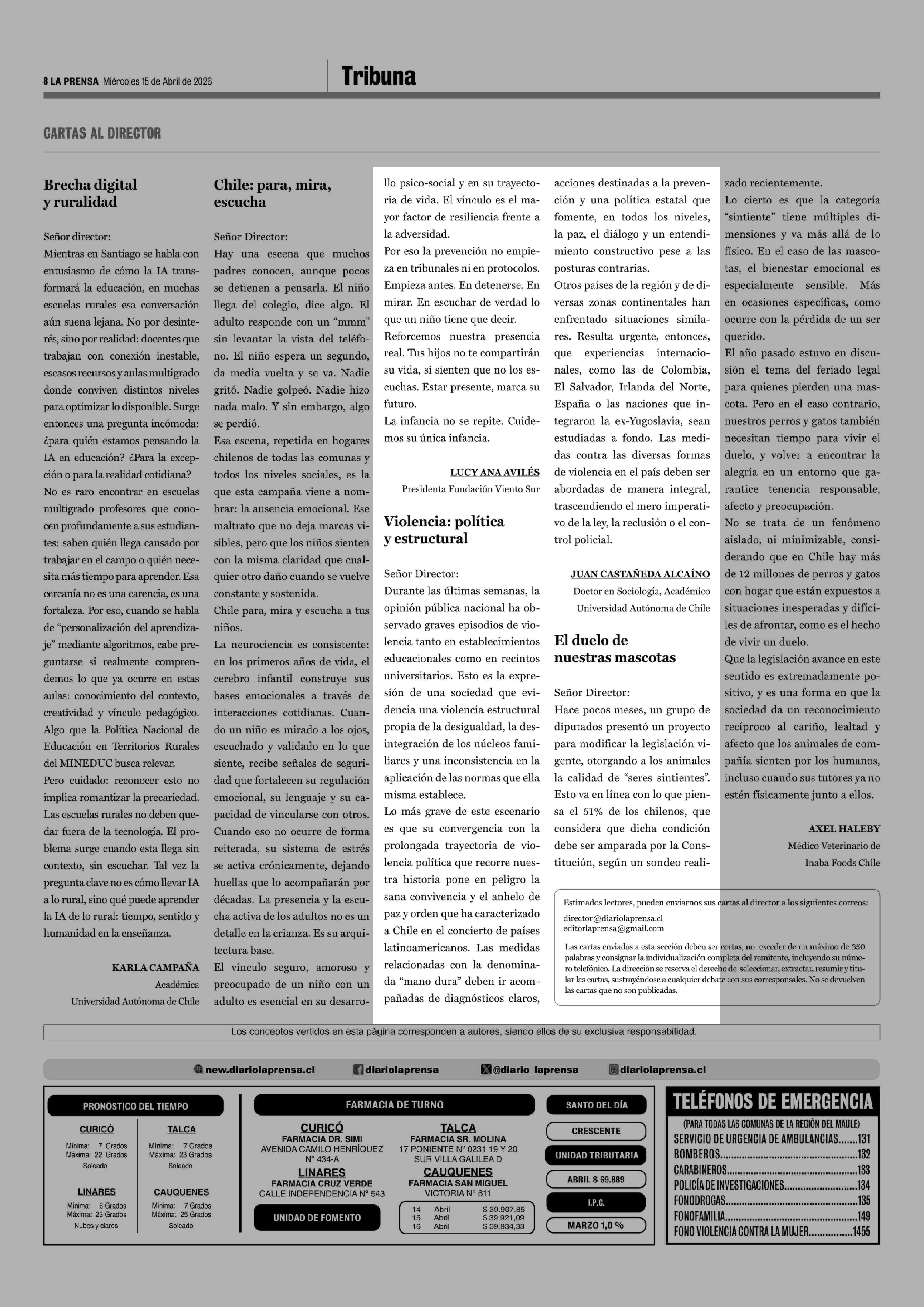Cartas: Violencia: política y estructural 15-04-2026 La Prensa de Curicó |