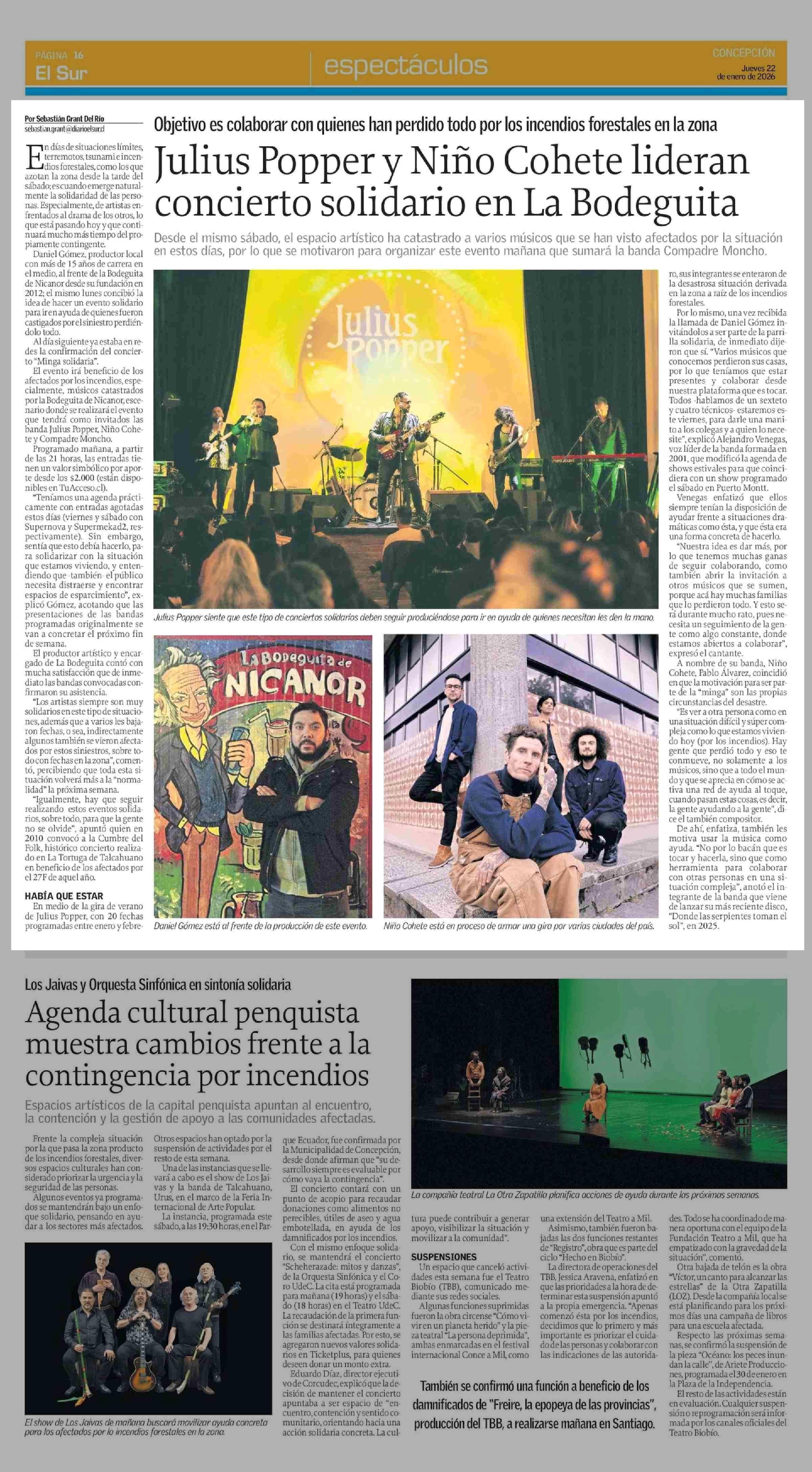Julius Popper y Niño Cohete lideran concierto solidario en La Bodeguita 22-01-2026 El Sur |