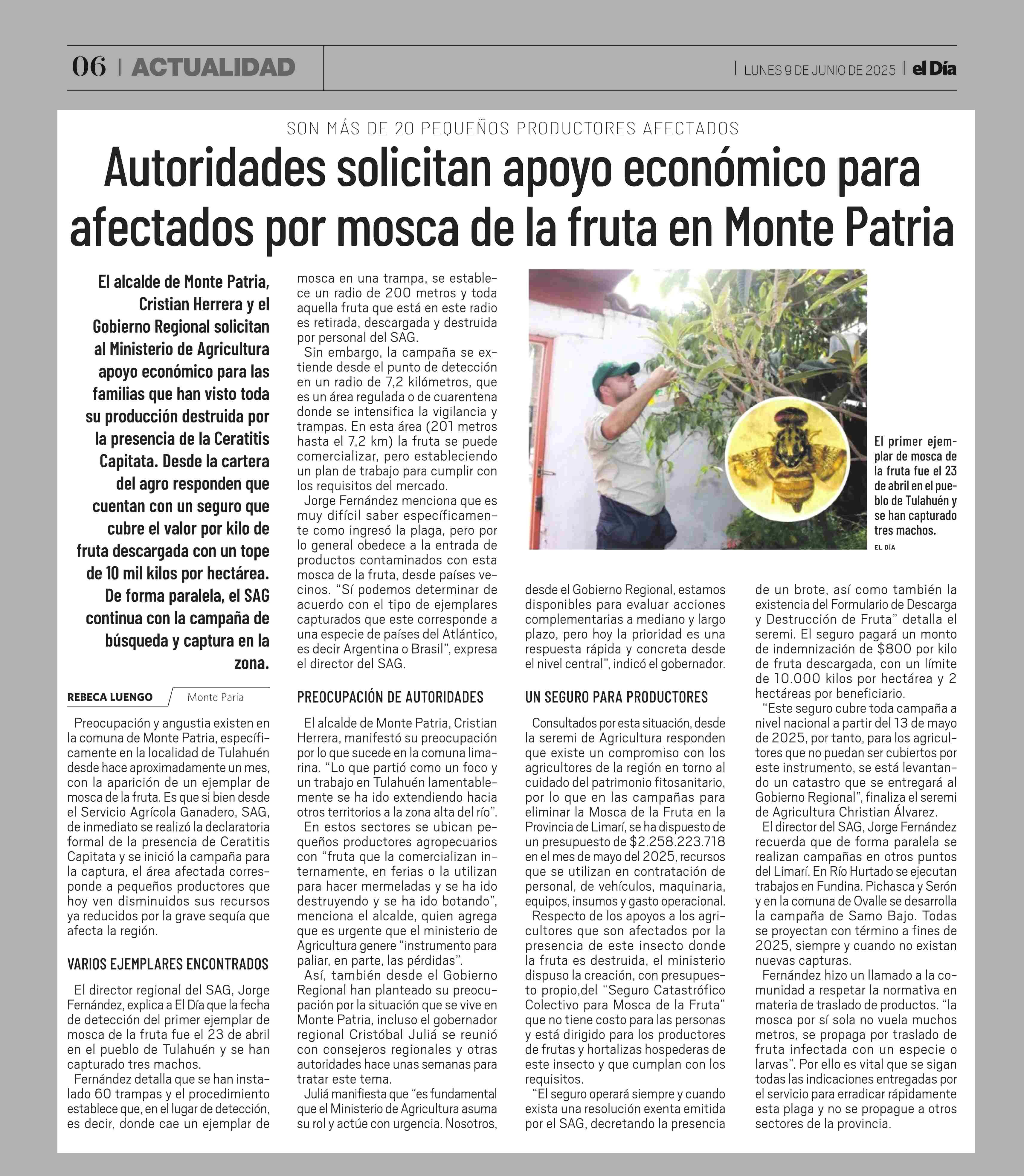 Autoridades solicitan apoyo económico para afectados por mosca de la fruta en Monte Patria 09-06-2025 El Día |