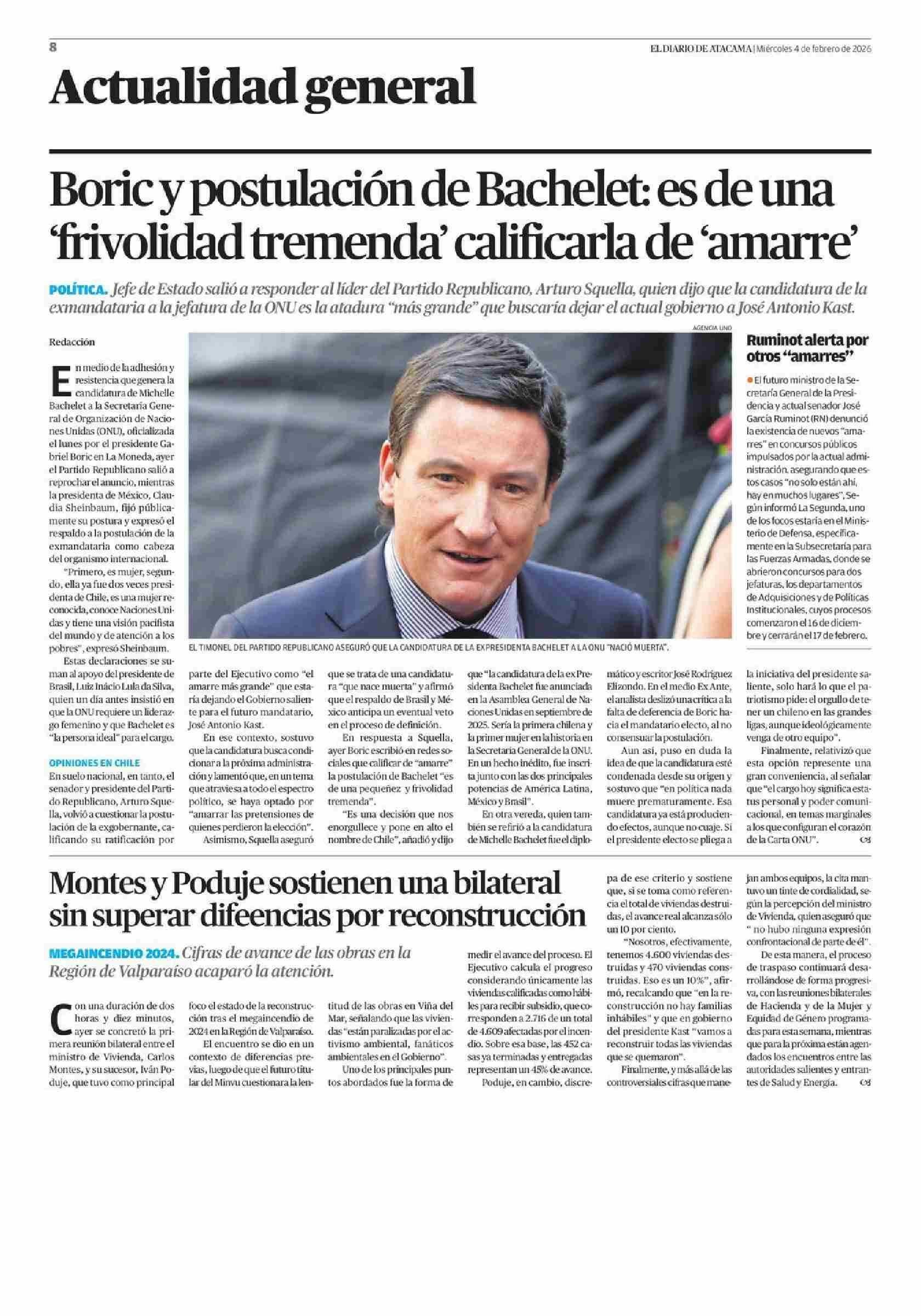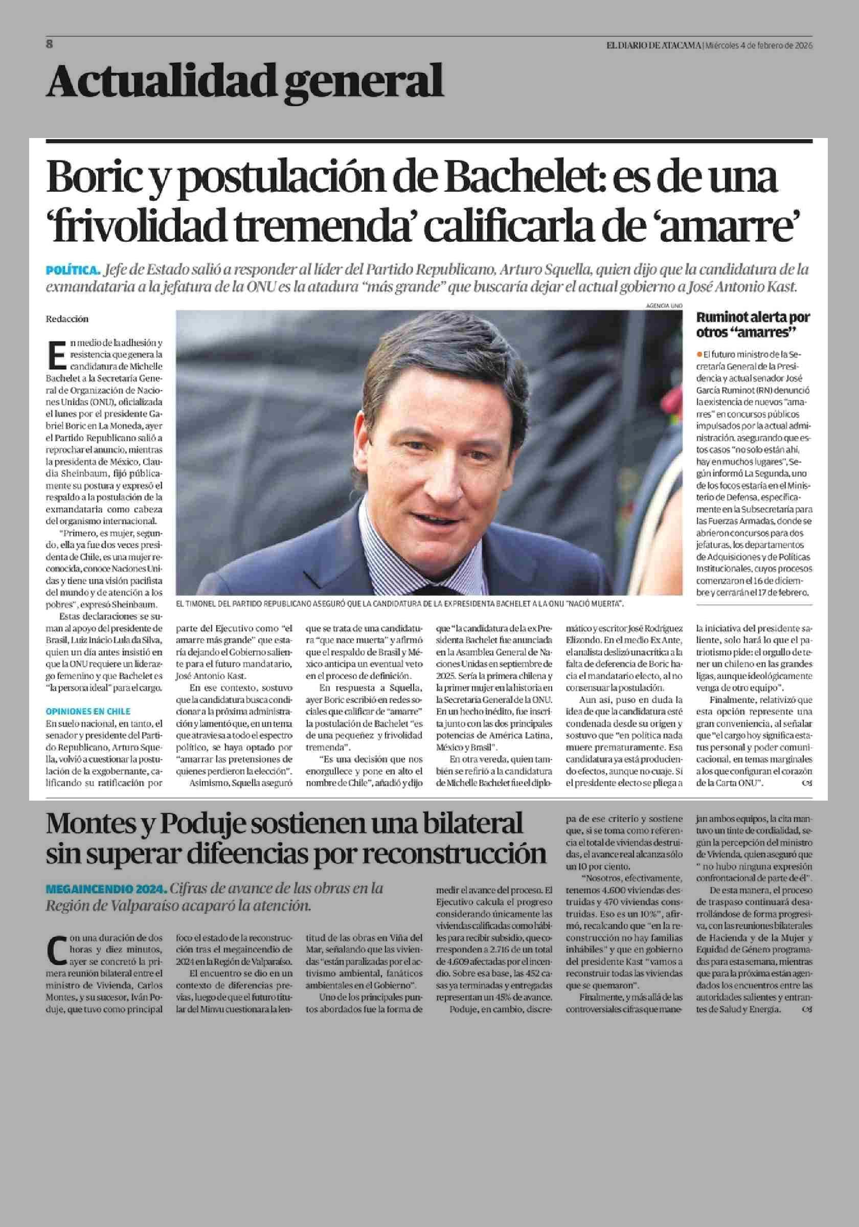 Boric y postulación de Bachelet: es de una frivolidad tremend?z' calificarla de amarre” 04-02-2026 El Diario de Atacama |