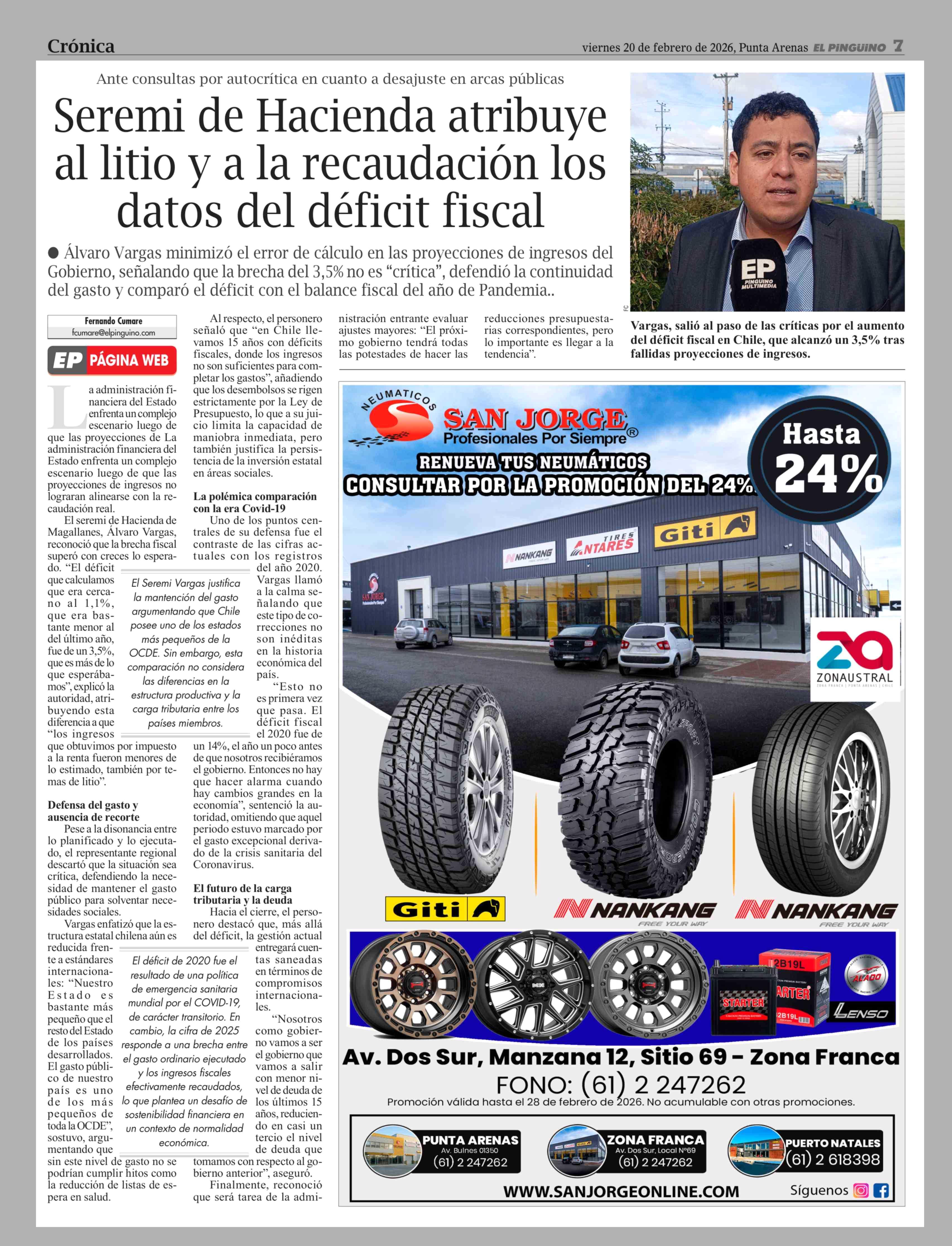 Seremi de Hacienda atribuye al litio y a la recaudación los datos del déficit fiscal 20-02-2026 El Pingüino |