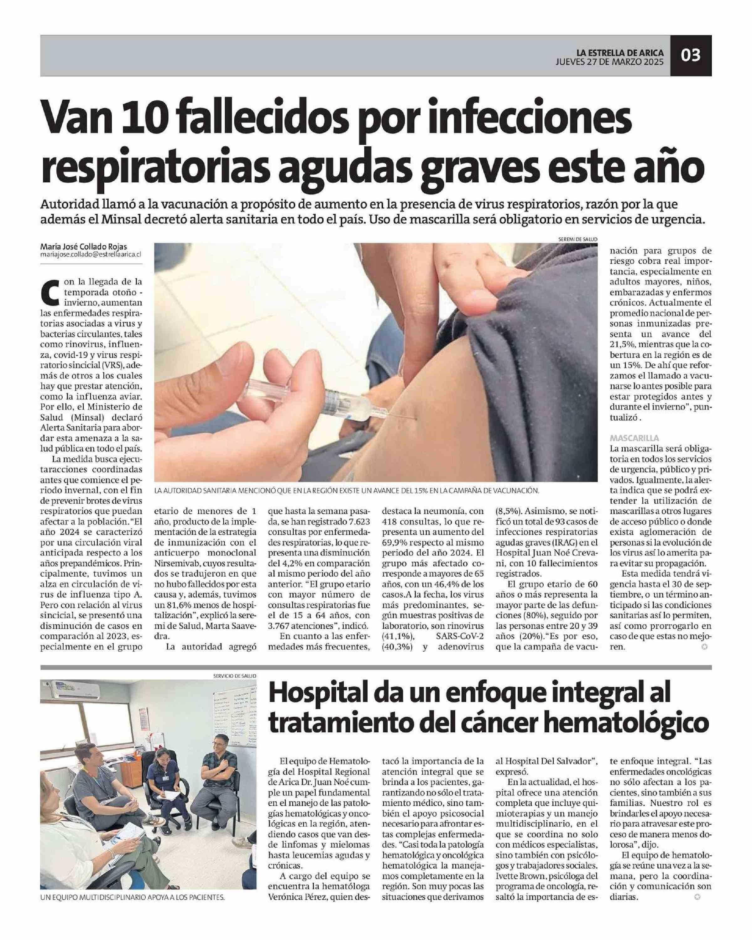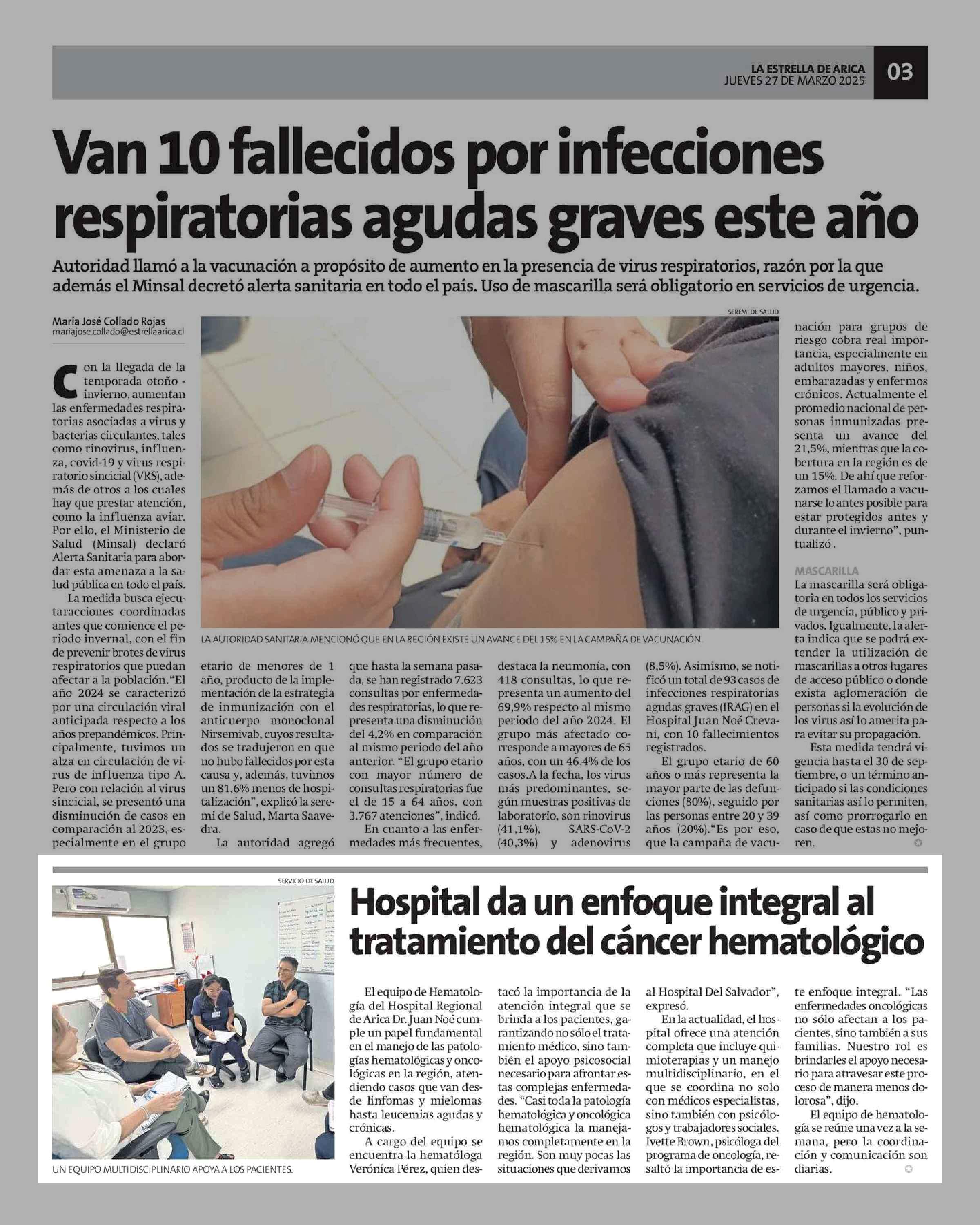 Hospital da un enfoque integral al tratamiento del cáncer hematológico 27-03-2025 La Estrella de Arica |
