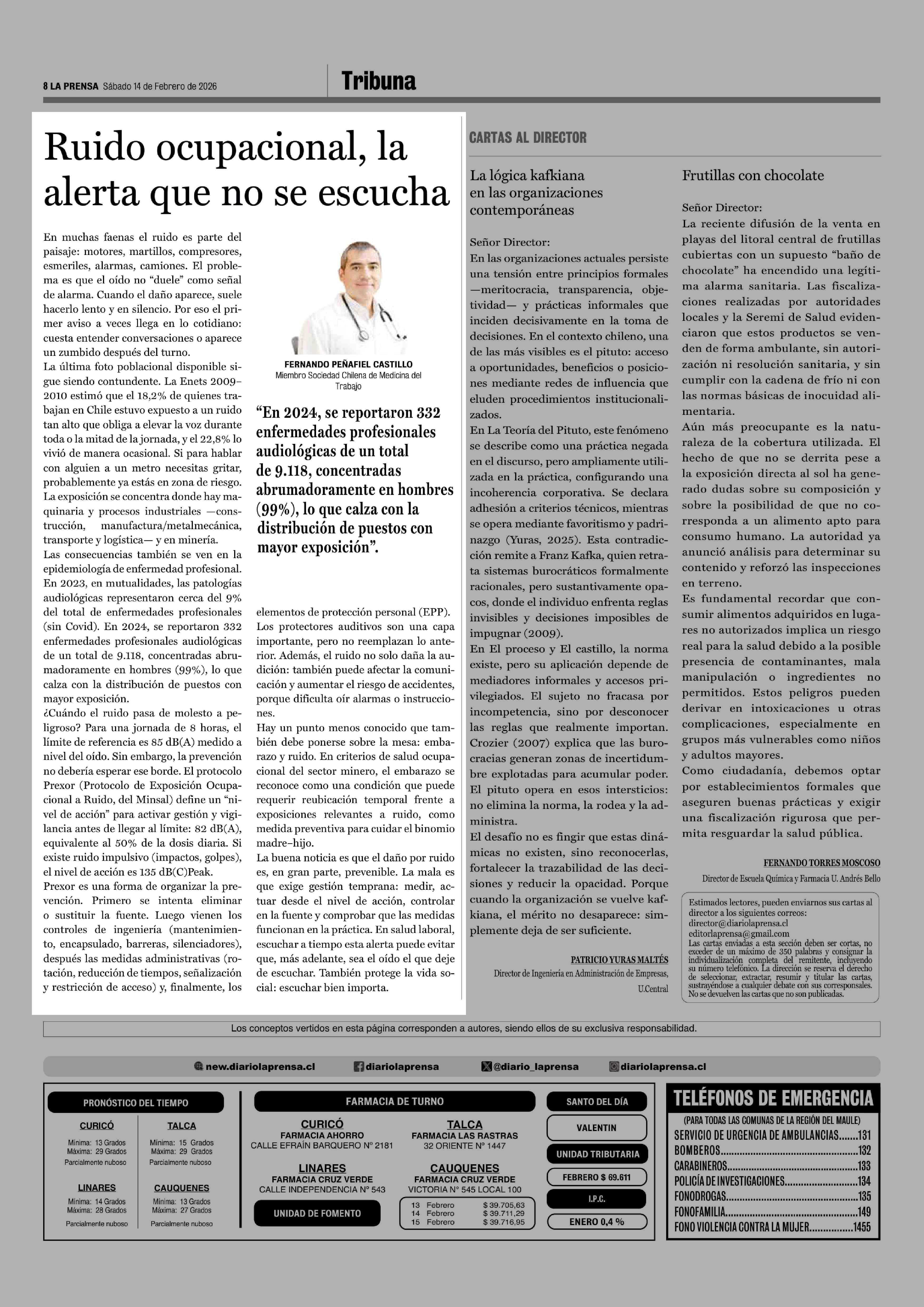 Columnas de Opinión: Ruido ocupacional, la alerta que no se escucha 14-02-2026 La Prensa de Curicó |