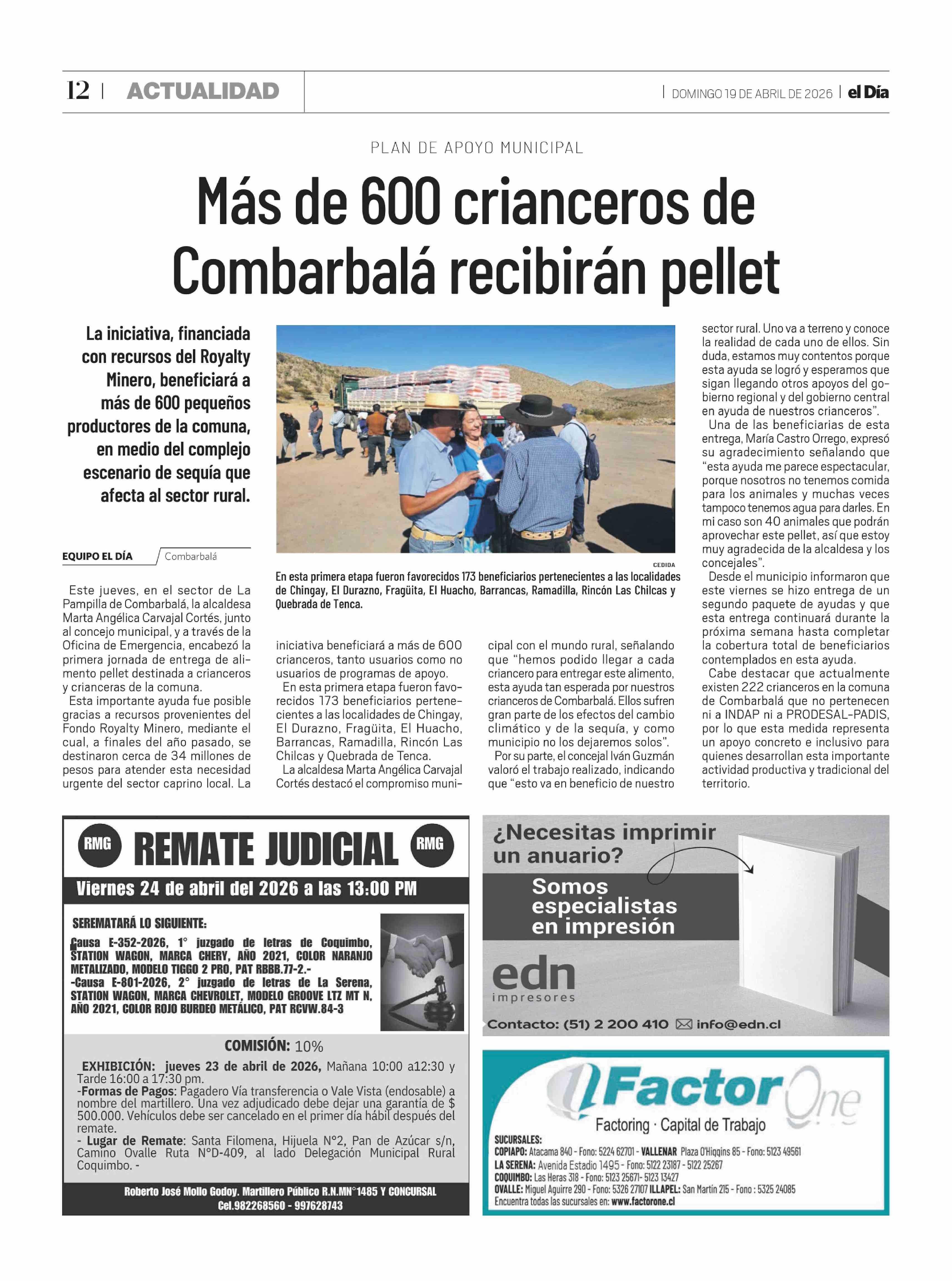Más de 600 crianceros de Combarbalá recibirán pellet 19-04-2026 El Día |
