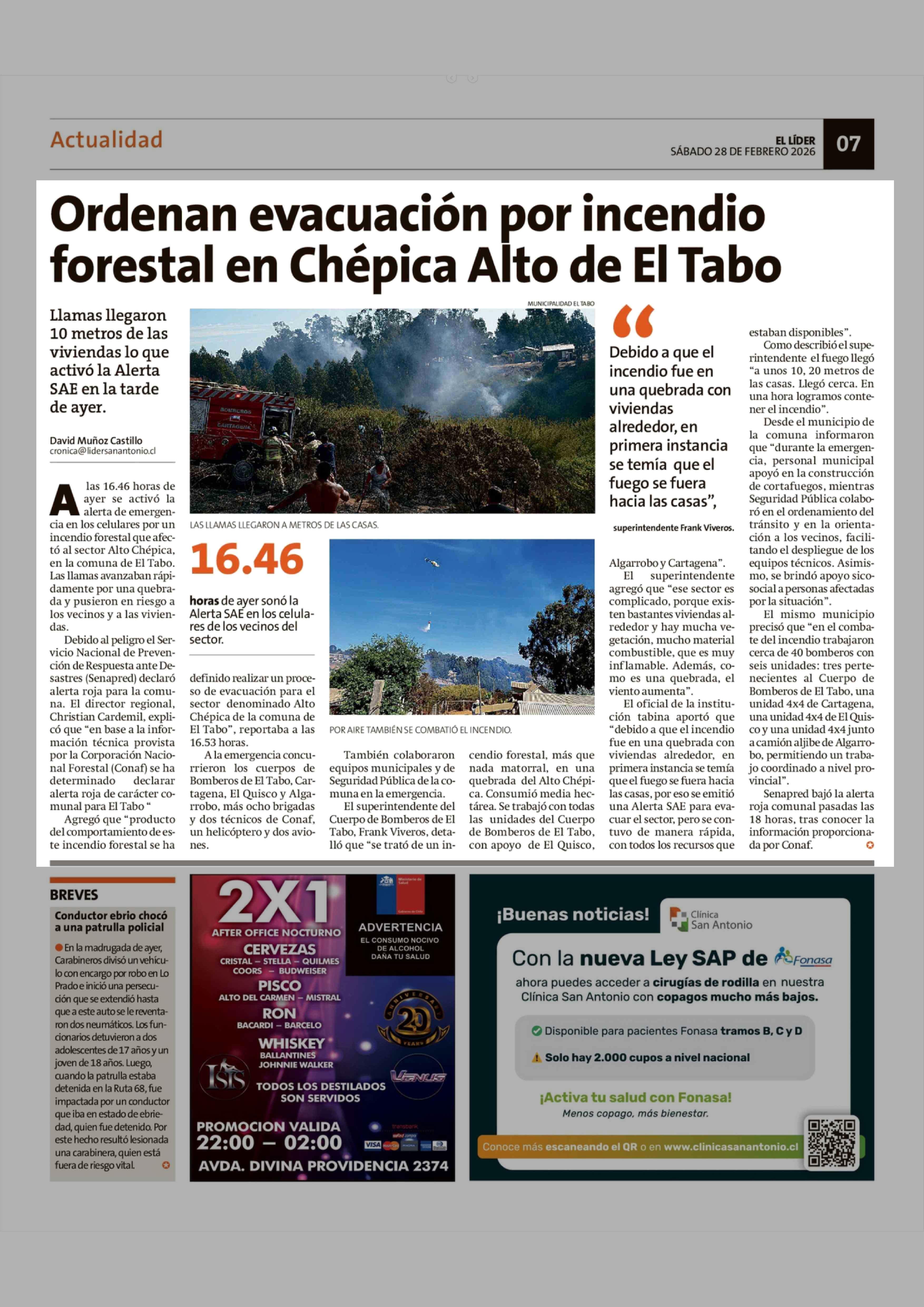 Ordenan evacuación por incendio forestal en Chépica Alto de El Tabo 28-02-2026 El Líder |