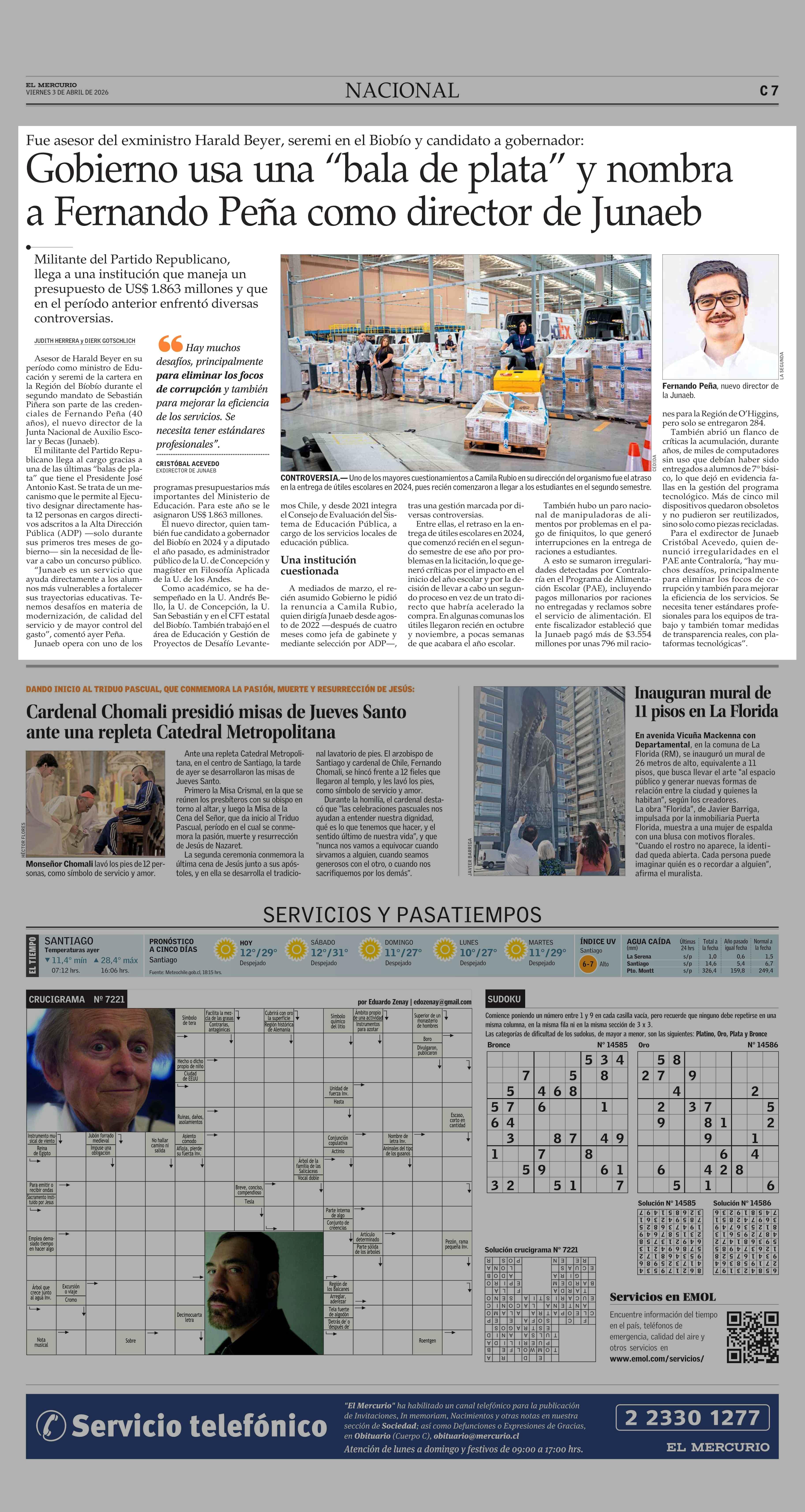 Gobierno usa una “bala de plata” y nombra a Fernando Peña como director de Junaeb 03-04-2026 El Mercurio |
