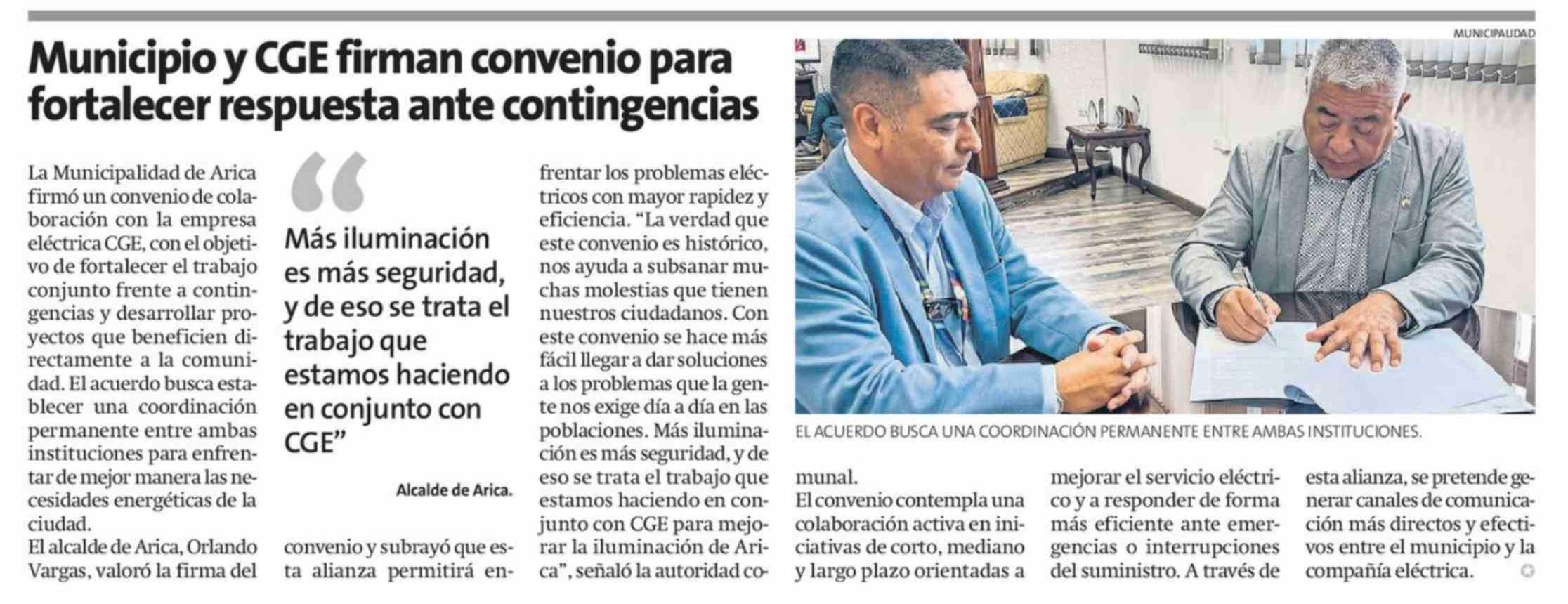 Municipio y CGE firman convenio para fortalecer respuesta ante contingencias 13-03-2026 La Estrella de Arica |