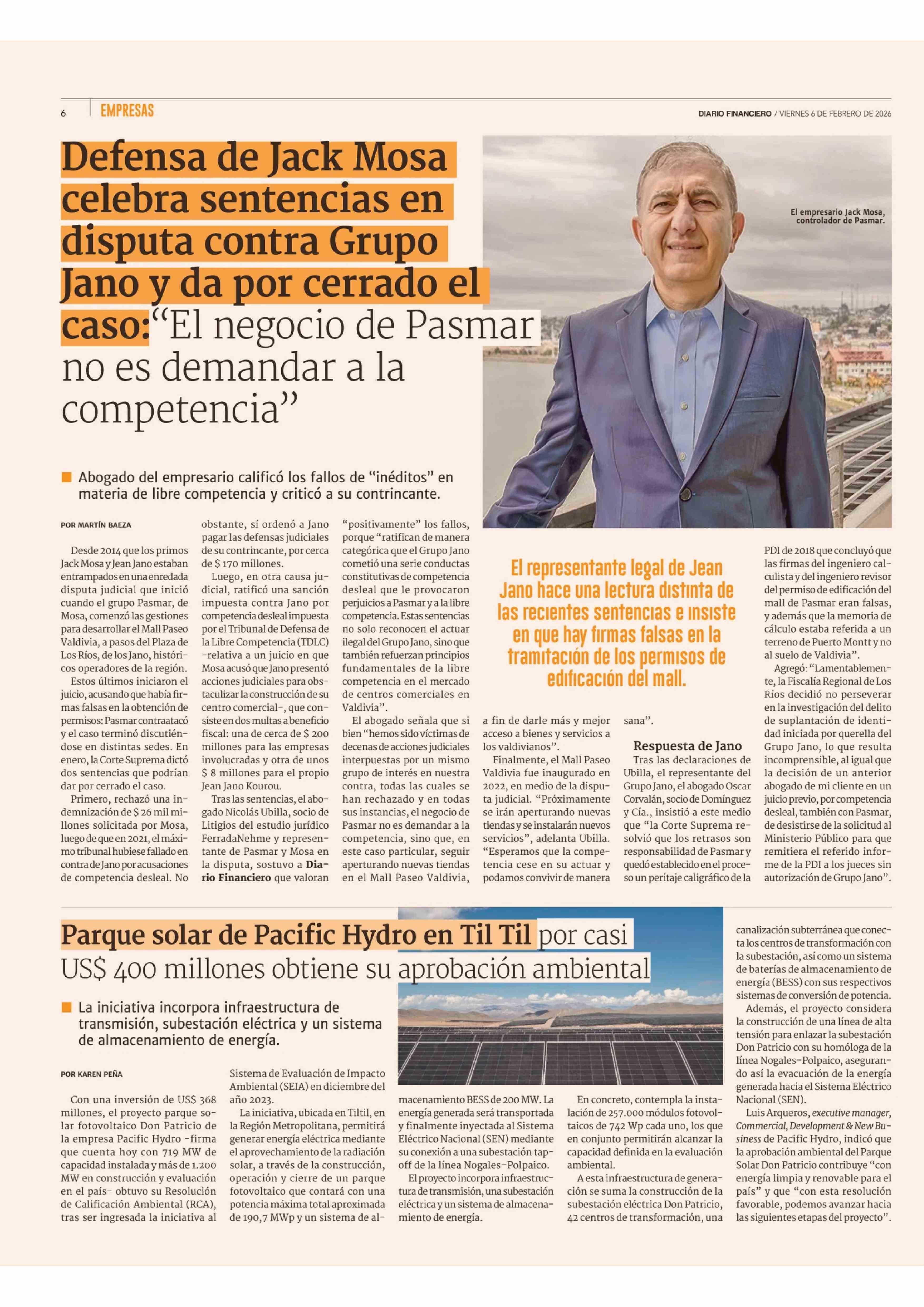 Parque solar de Pacific Hydro en Til Til por casi US$ 400 millones obtiene su aprobación ambiental 06-02-2026 Diario Financiero |