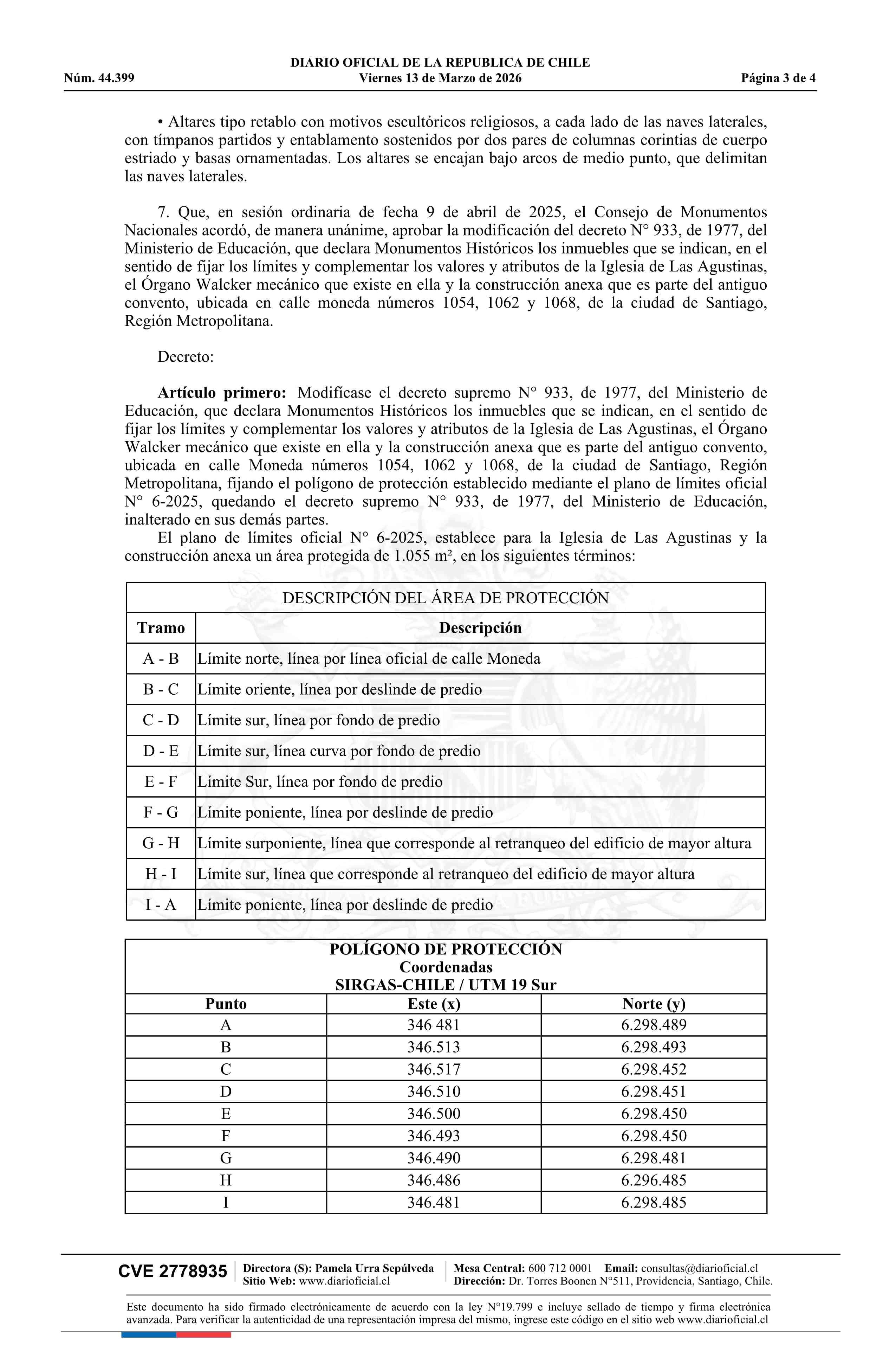 | Título: | Decreto exento número 32, de 2026.- Modifica decreto N° 933, de 1977, del Ministerio de Educación, que declara Monumento Nacional, en la categoría de Monumento Histórico, a la Iglesia de Las Agustinas y el órgano Walcker mecánico que existe en ella y la construcción anexa que es parte del antiguo co |