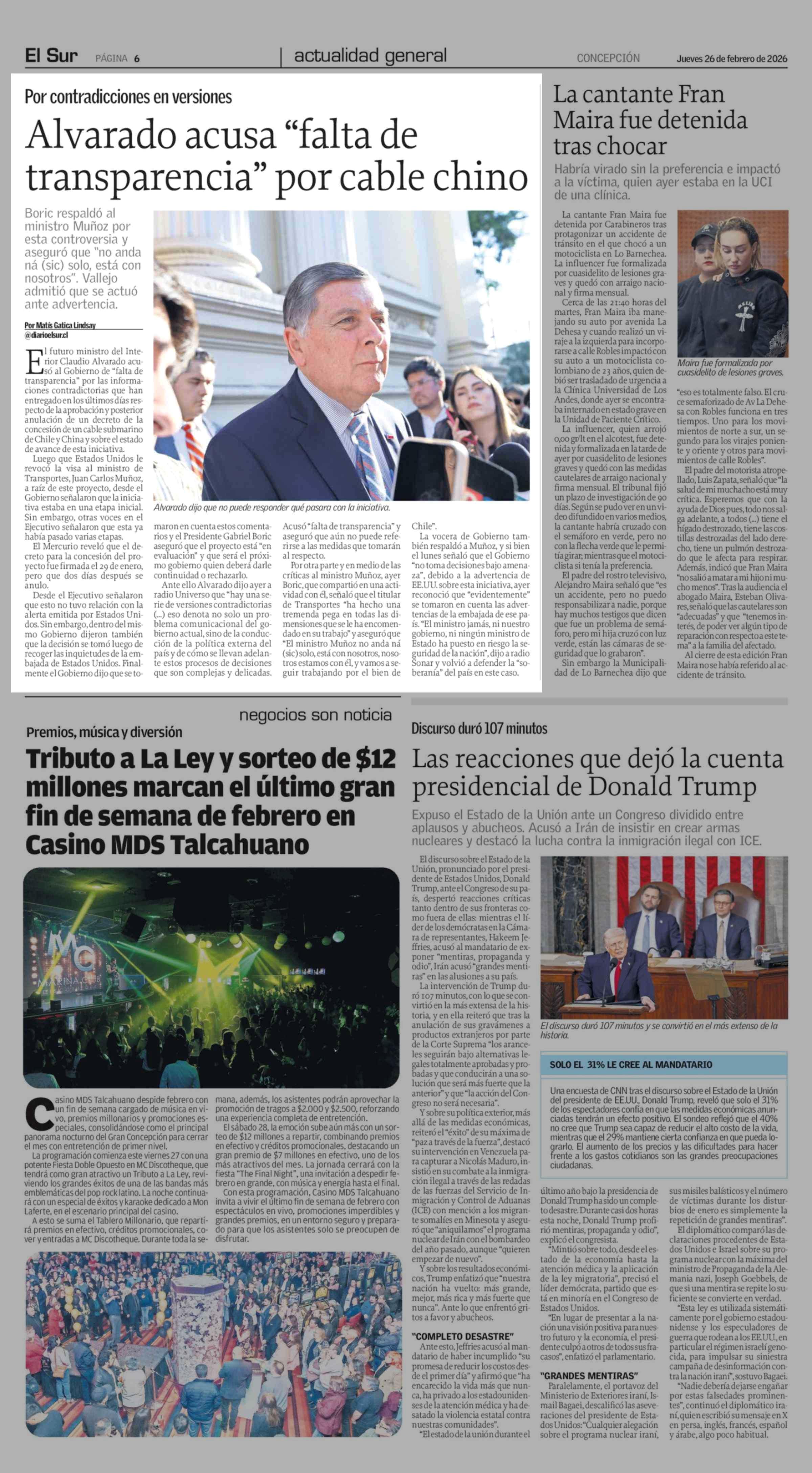 Alvarado acusa "falta de transparencia" por cable chino 26-02-2026 El Sur |