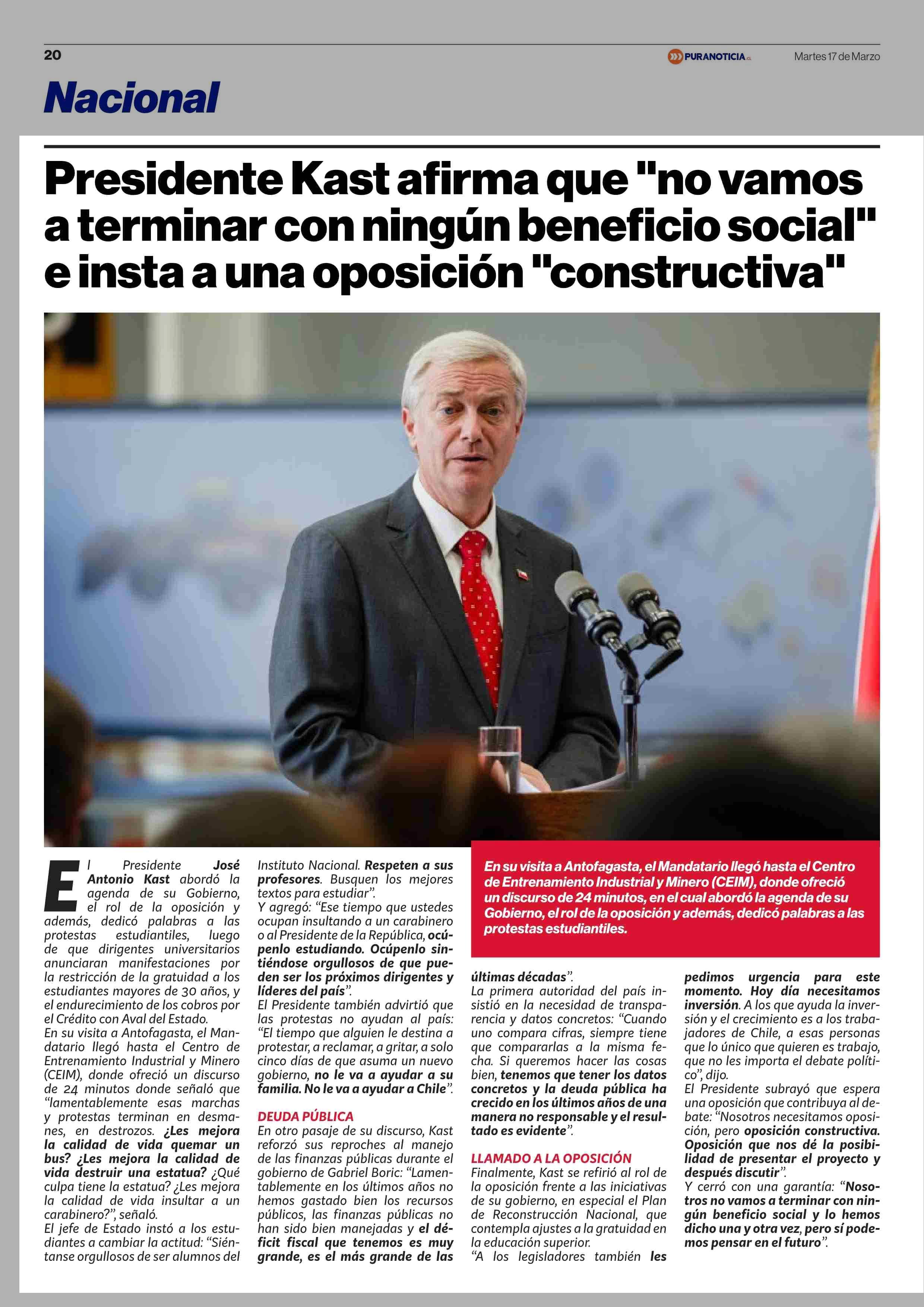 Título: Presidente Kast afirma que "no vamos a terminar con ningún beneficio social" e insta a una oposición "constructiva"