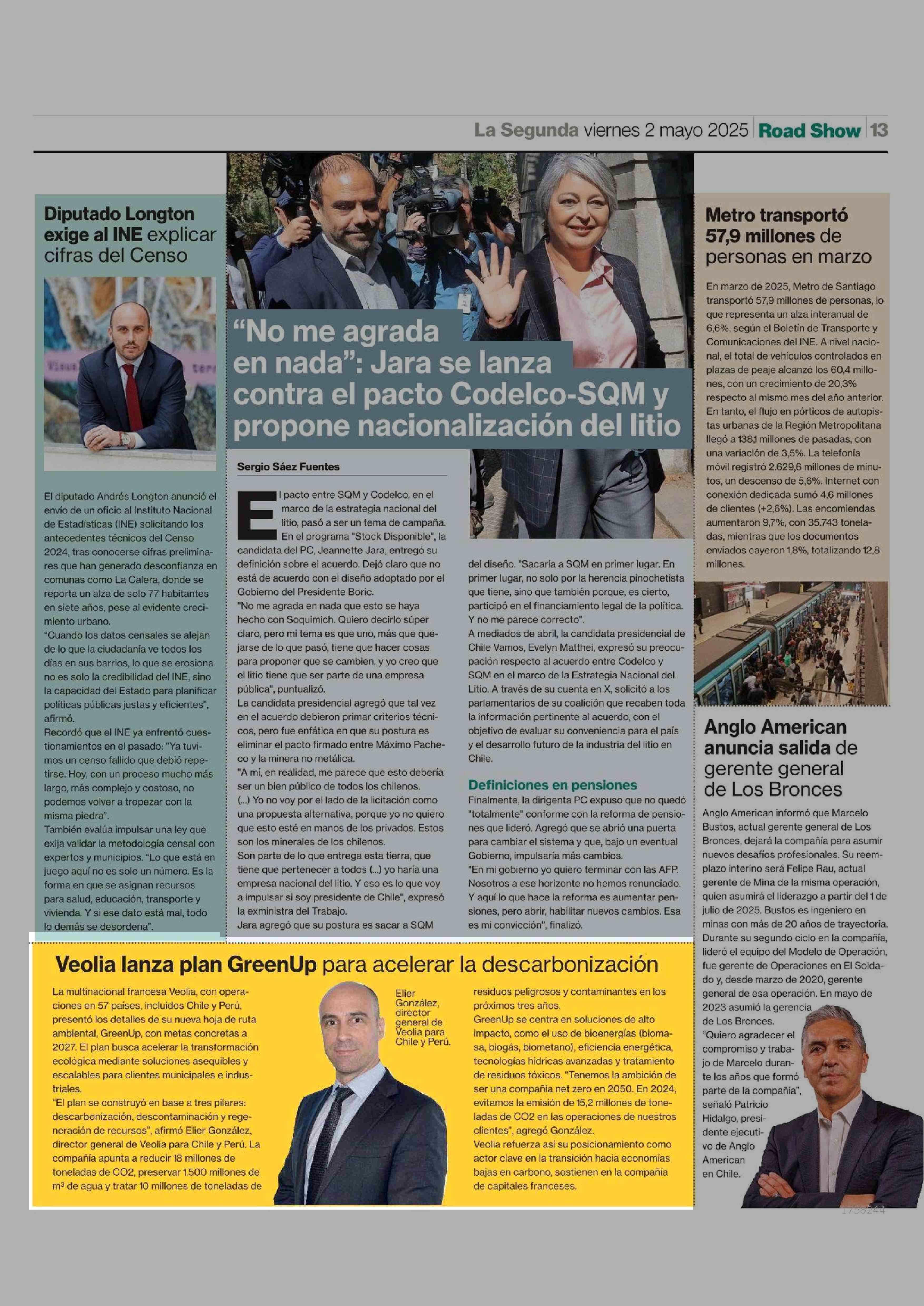 Veolia lanza plan GreenUp para acelerar la descarbonización 02-05-2025 La Segunda |