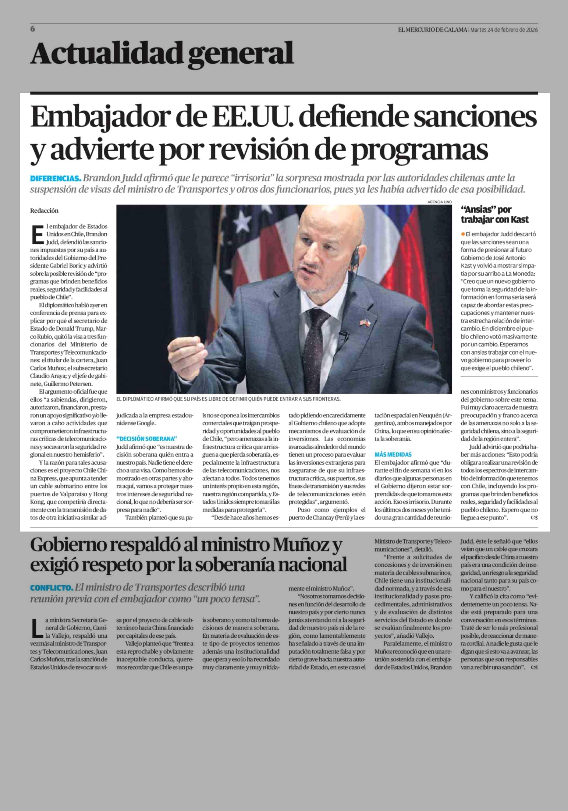 Embajador de EE.UU. defiende sanciones y advierte por revisión de programas 24-02-2026 El Mercurio de Calama |