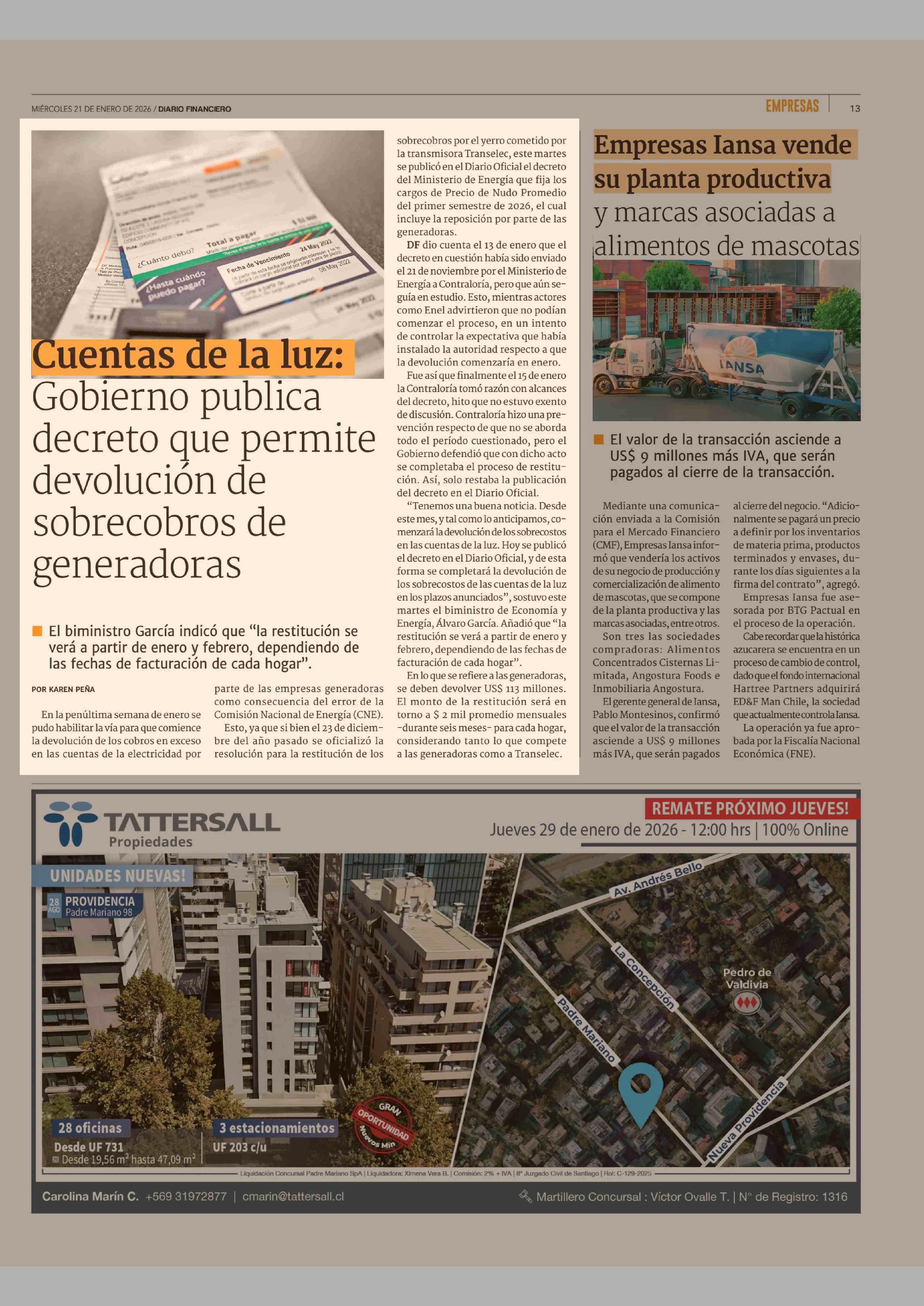 Cuentas de la luz: Gobierno publica decreto que permite devolución de sobrecobros de generadoras 21-01-2026 Diario Financiero |