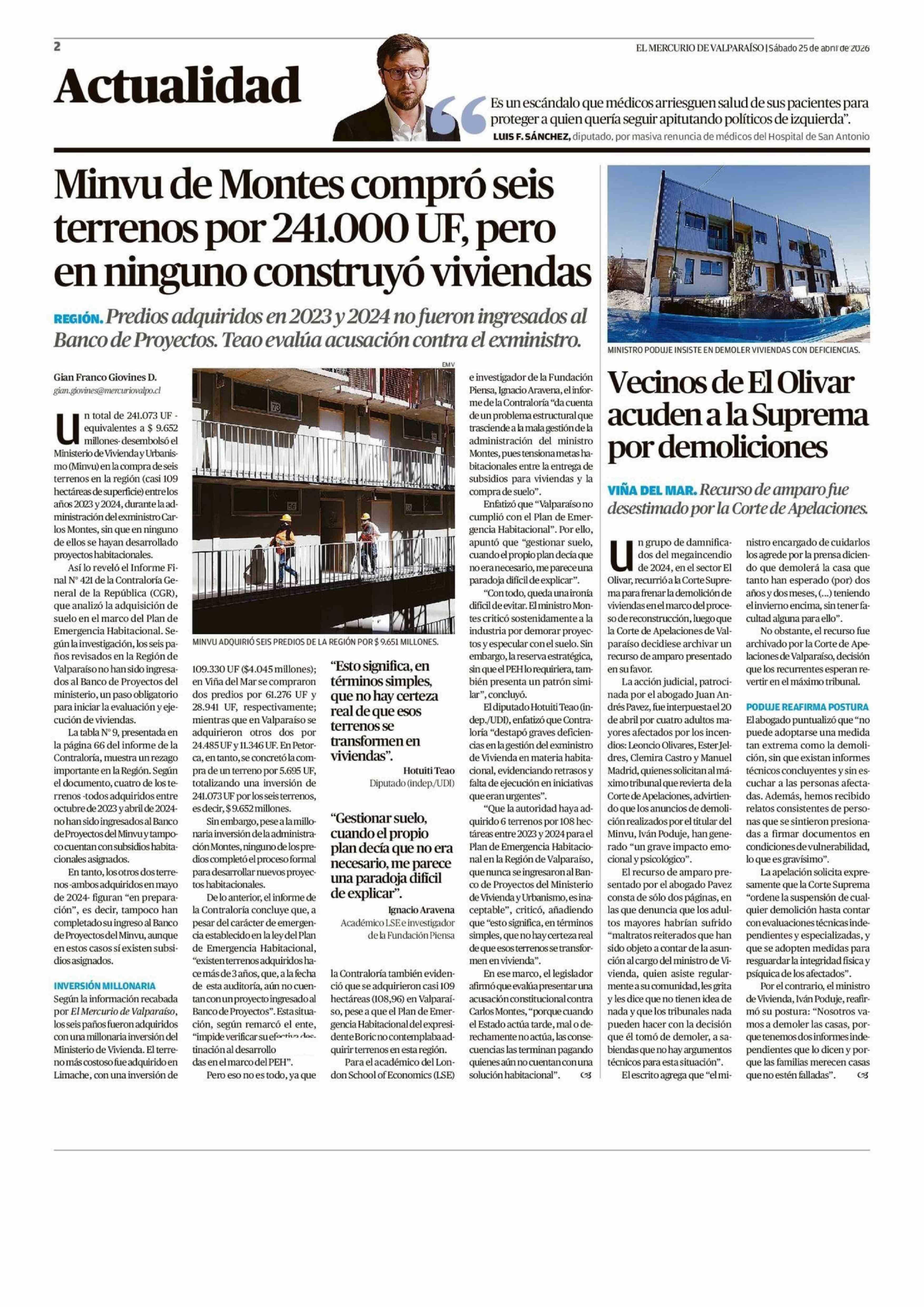 LUIS F. SÁNCHEZ, diputado, por masiva renuncia de médicos del Hospital de San Antonio 25-04-2026 El Mercurio de Valparaíso |