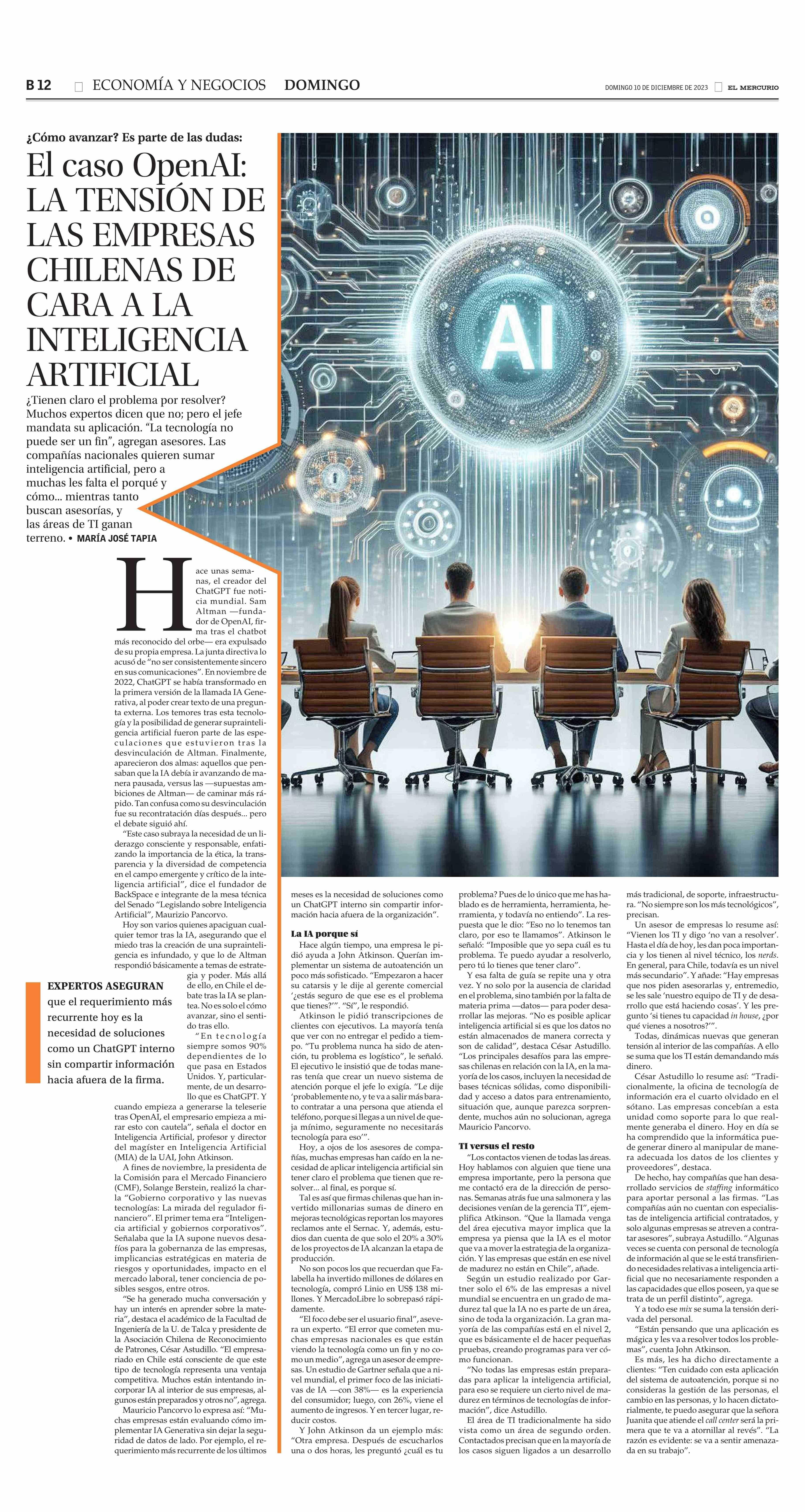 El caso OpenAI: LA TENSIÓN DE LAS EMPRESAS CHILENAS DE CARA A LA INTELIGENCIA ARTIFICIAL 10-12-2023 El Mercurio |