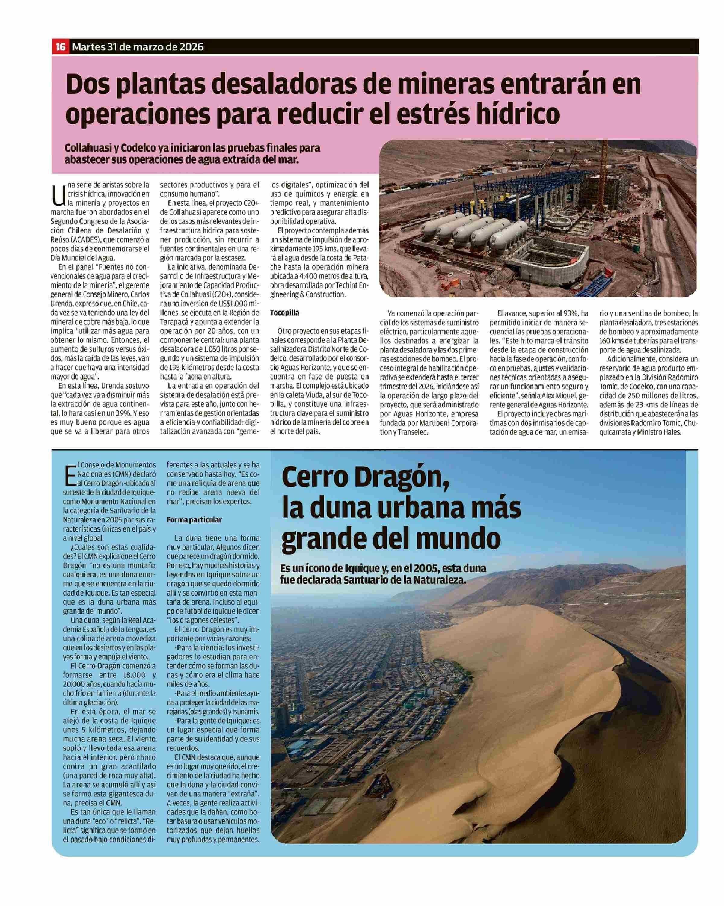 Dos plantas desaladoras de mineras entrarán en operaciones para reducir el estrés hídrico 31-03-2026 El Austral de Osorno |