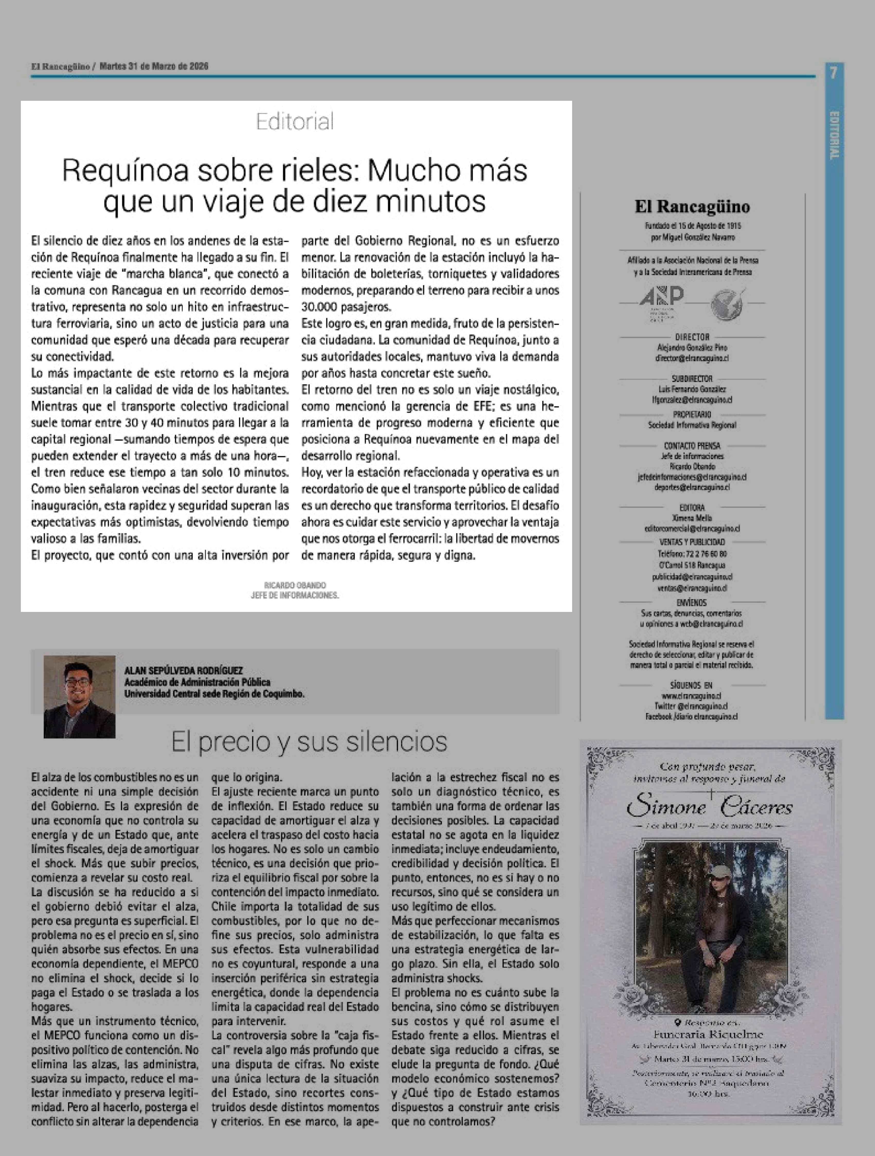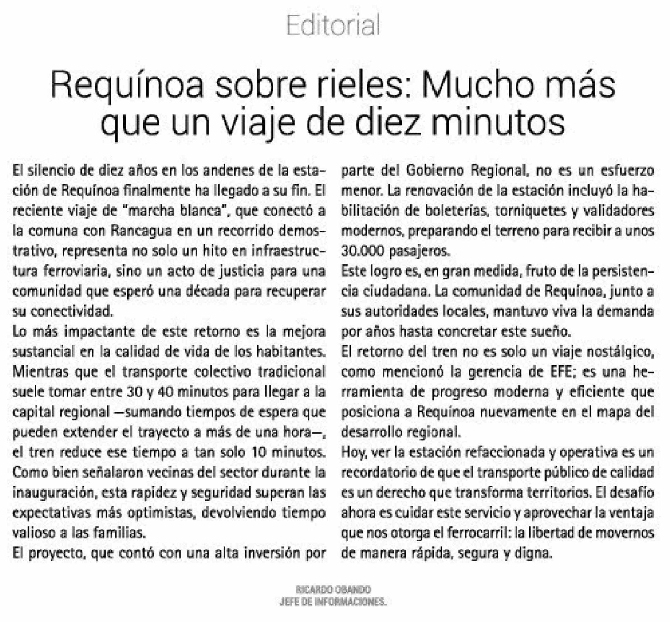 Editorial: Requínoa sobre rieles: Mucho más que un viaje de diez minutos 31-03-2026 El Rancagüino |