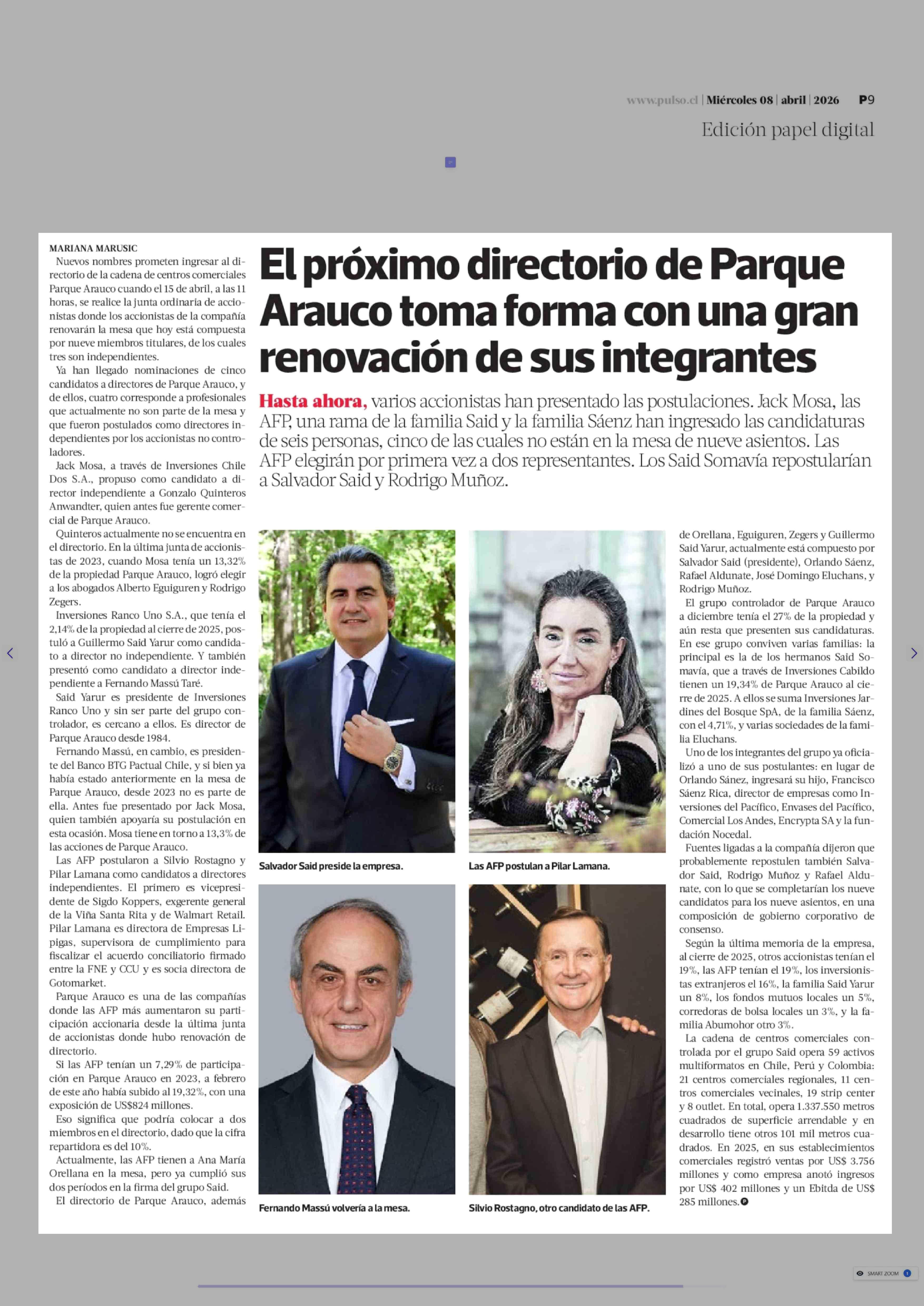 El próximo directorio de Parque Arauco toma forma con una gran renovación de sus integrantes 08-04-2026 La Tercera |