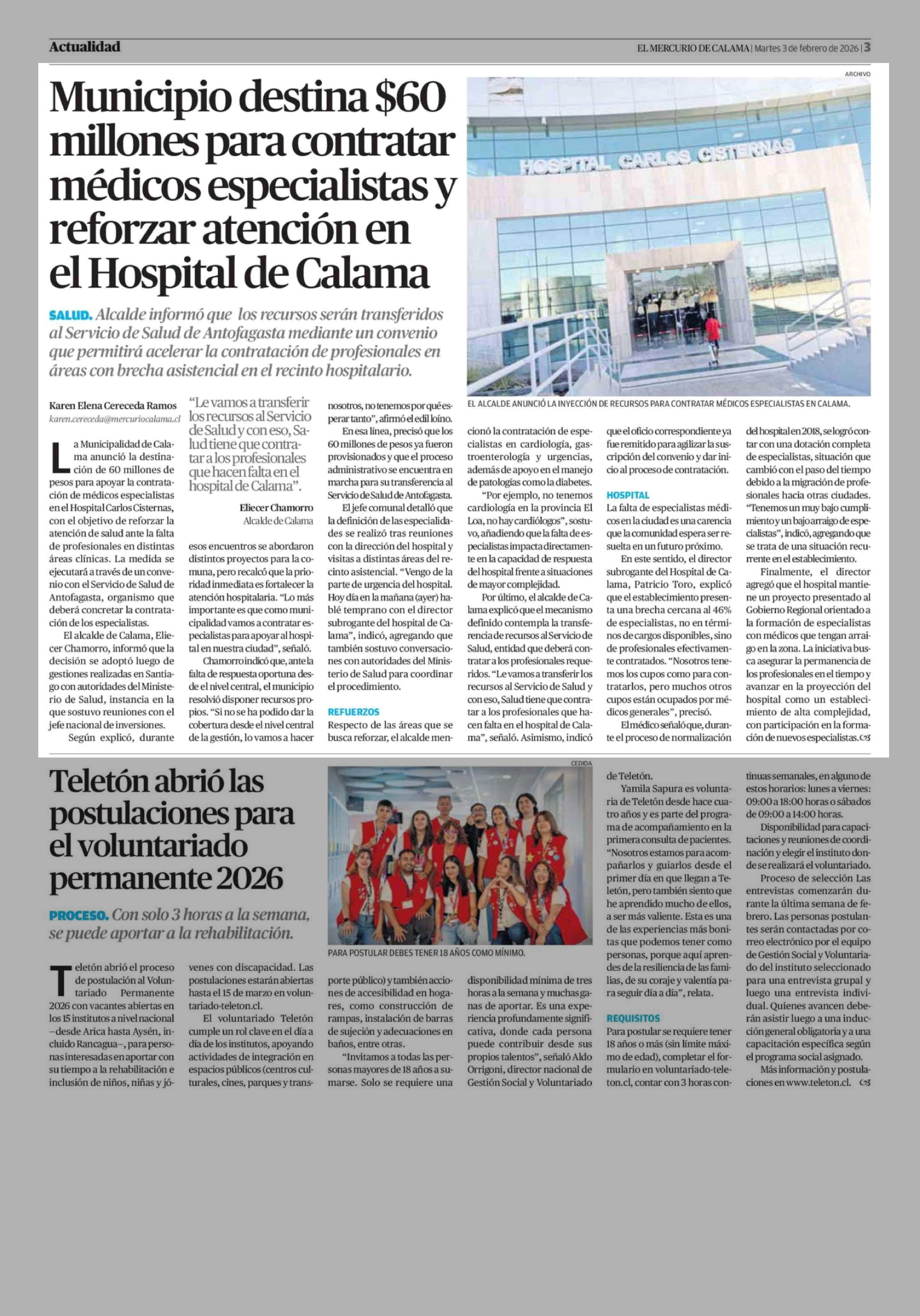 Municipio destina $60 millones para contratar médicos especialistas y reforzar atención en el Hospital de Calama 03-02-2026 El Mercurio de Calama |