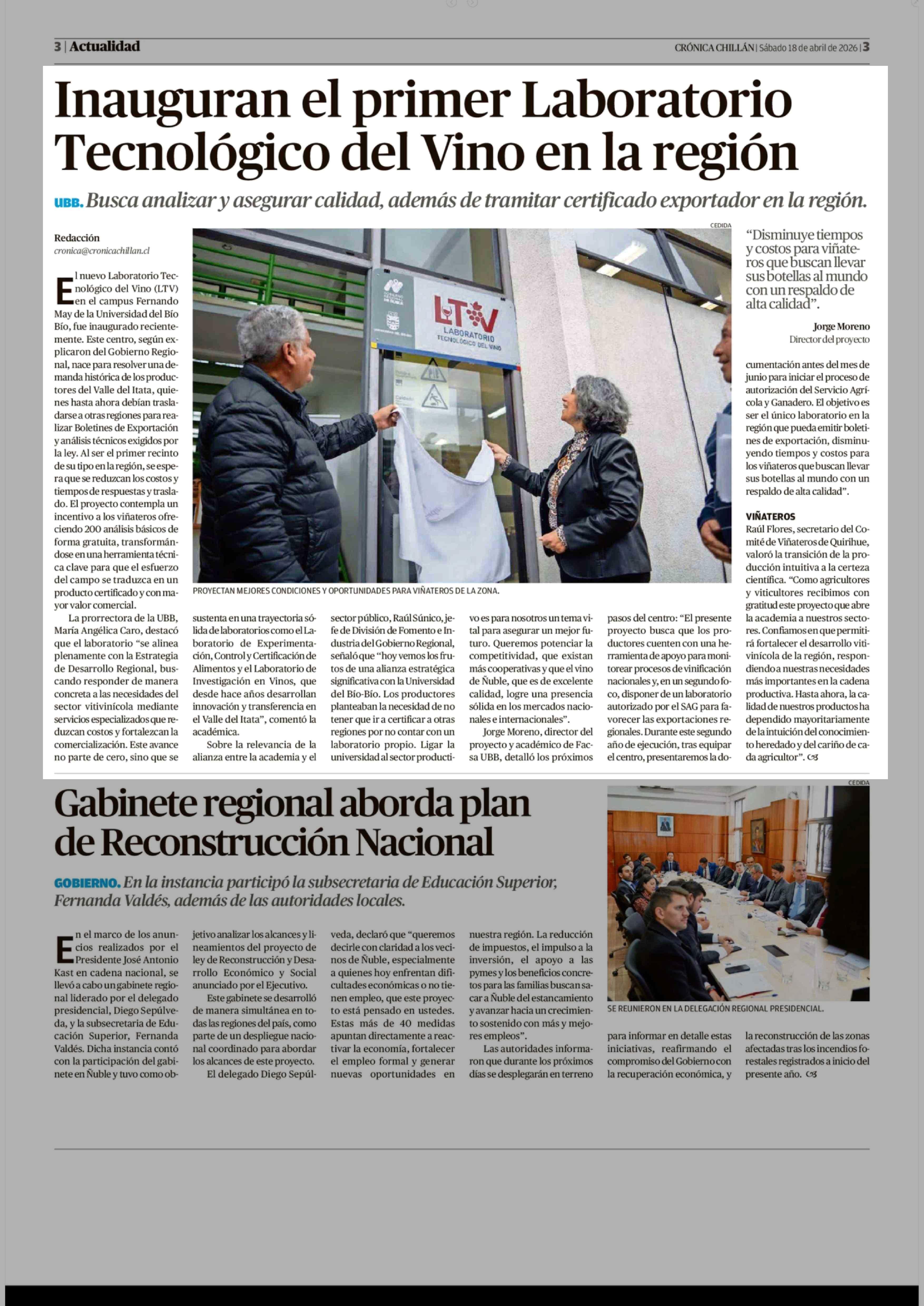 Inauguran el primer Laboratorio Tecnológico del Vino en la región 19-04-2026 Crónica de Chillán |