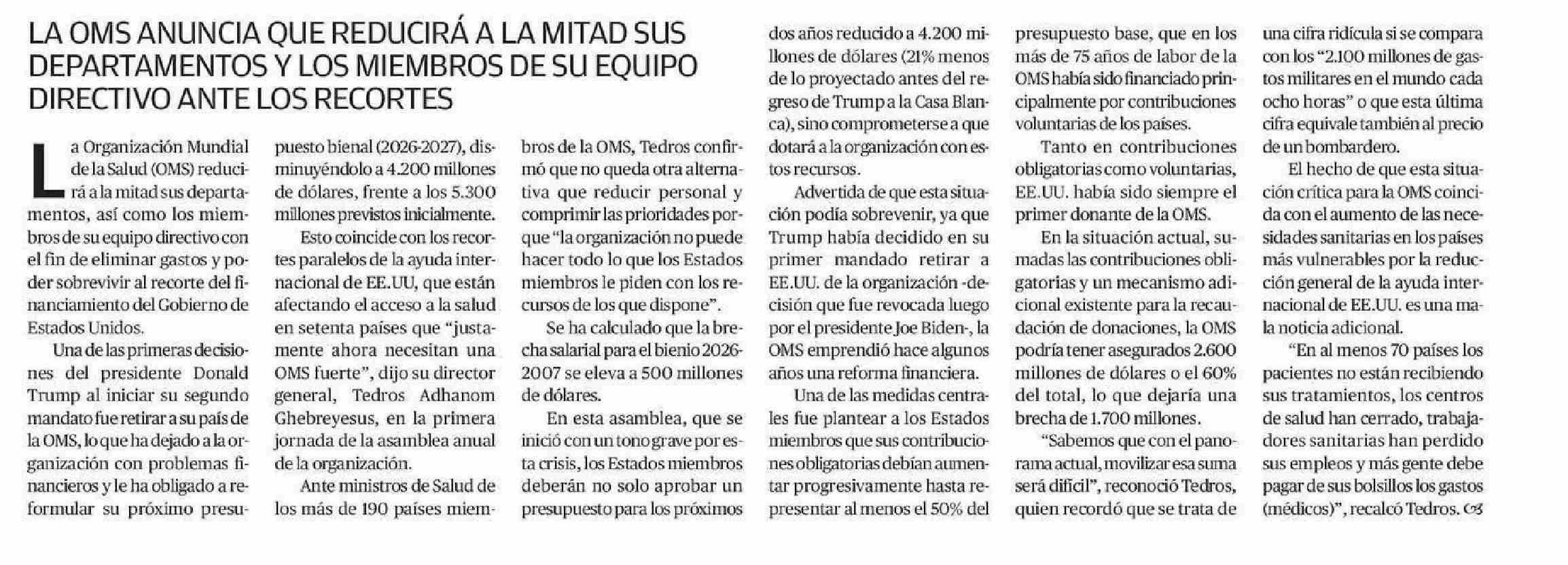 LA OMS ANUNCIA QUE REDUCIRÁ A LA MITAD SUS DEPARTAMENTOS Y LOS MIEMBROS DE SU EQUIPO DIRECTIVO ANTE LOS RECORTES 20-05-2025 El Mercurio de Antofagasta |