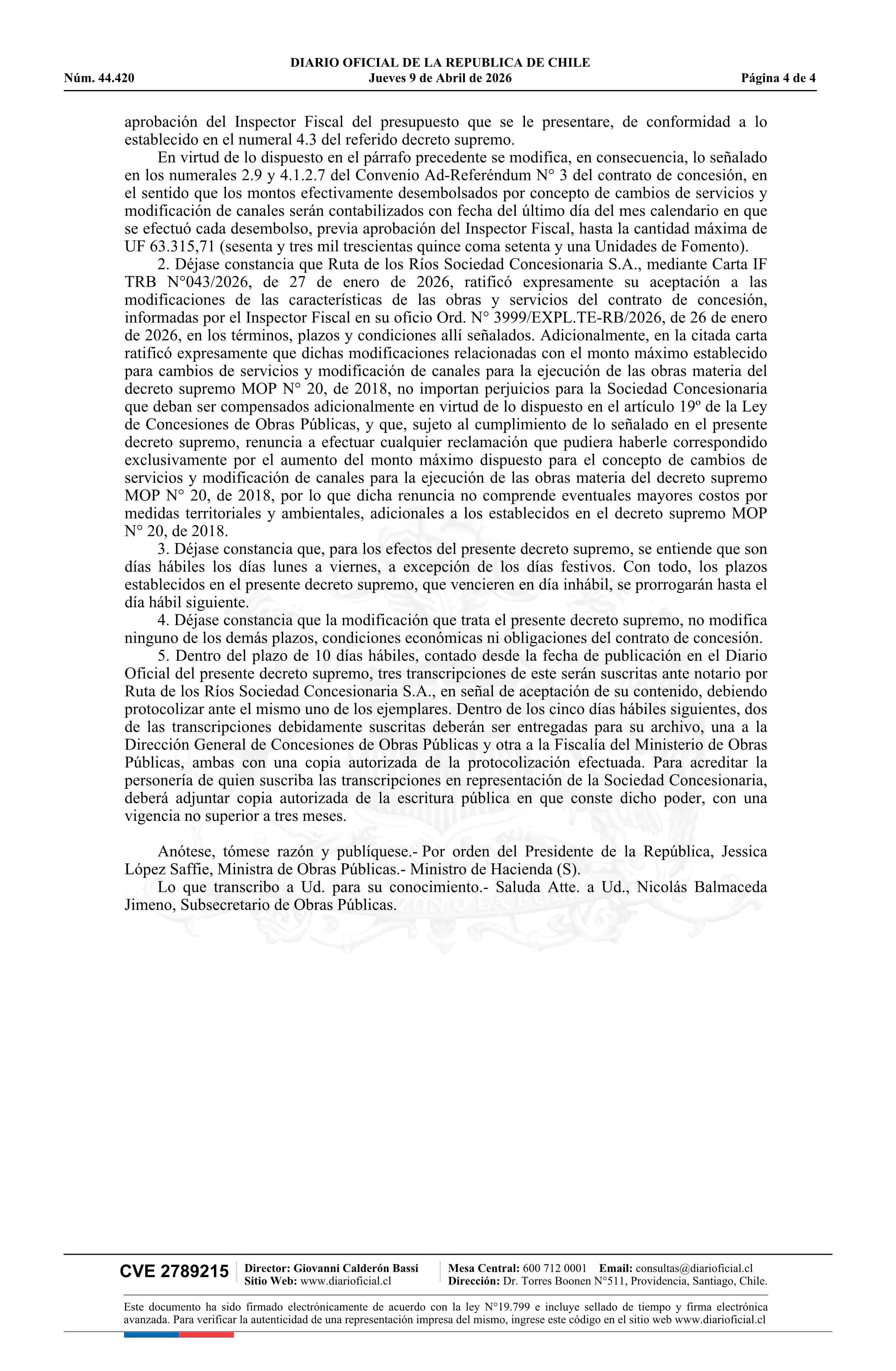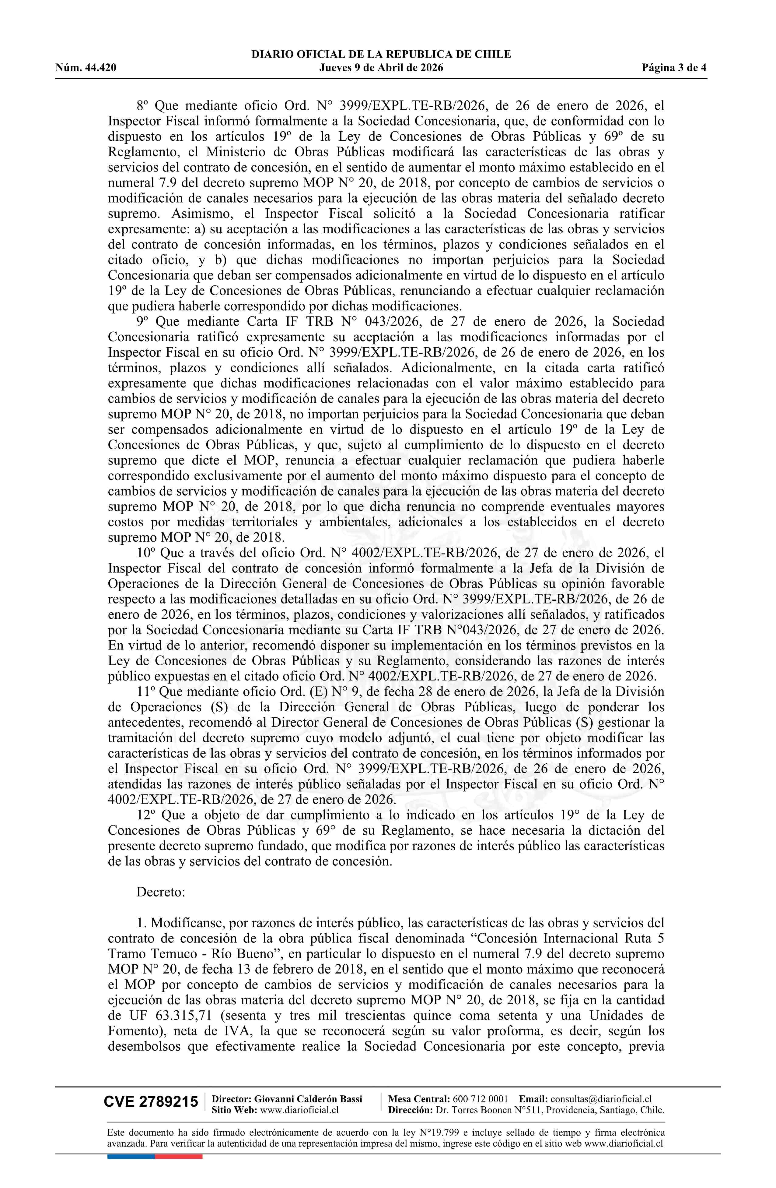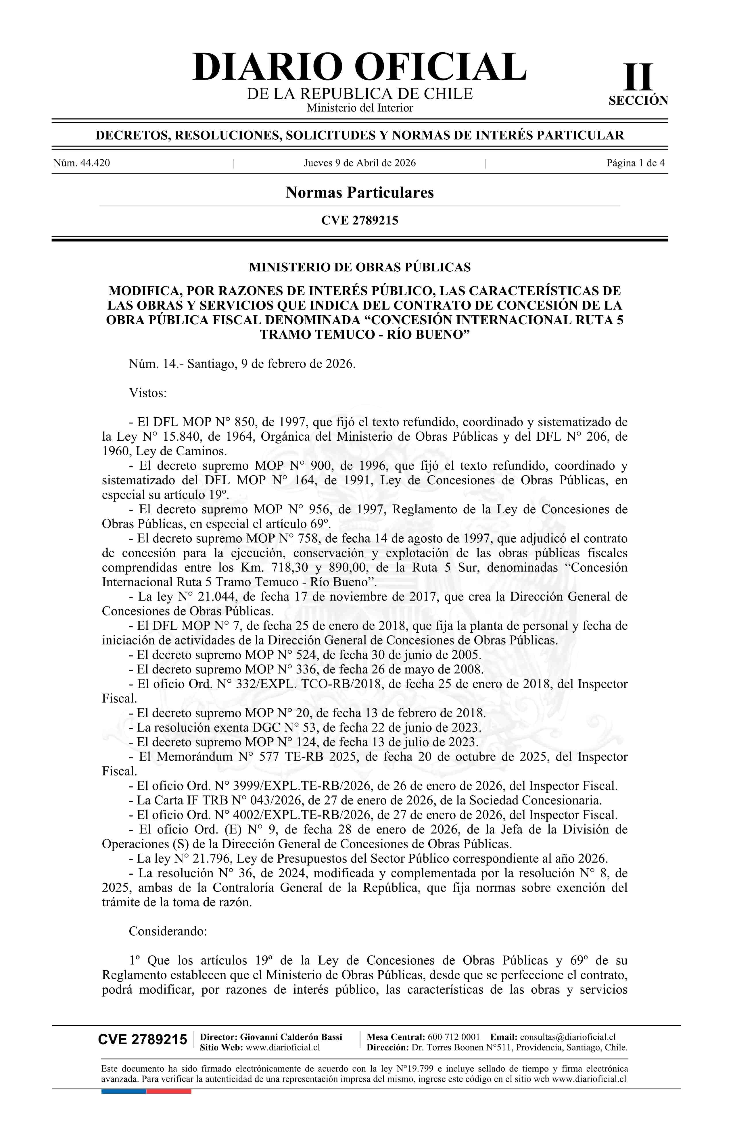 Título: Decreto número 14, de 2026.- Modifica, por razones de interés público, las características de las obras y servicios que indica del contrato de concesión de la obra pública fiscal denominada Concesión Internacional Ruta 5 Tramo Temuco - Río Bueno