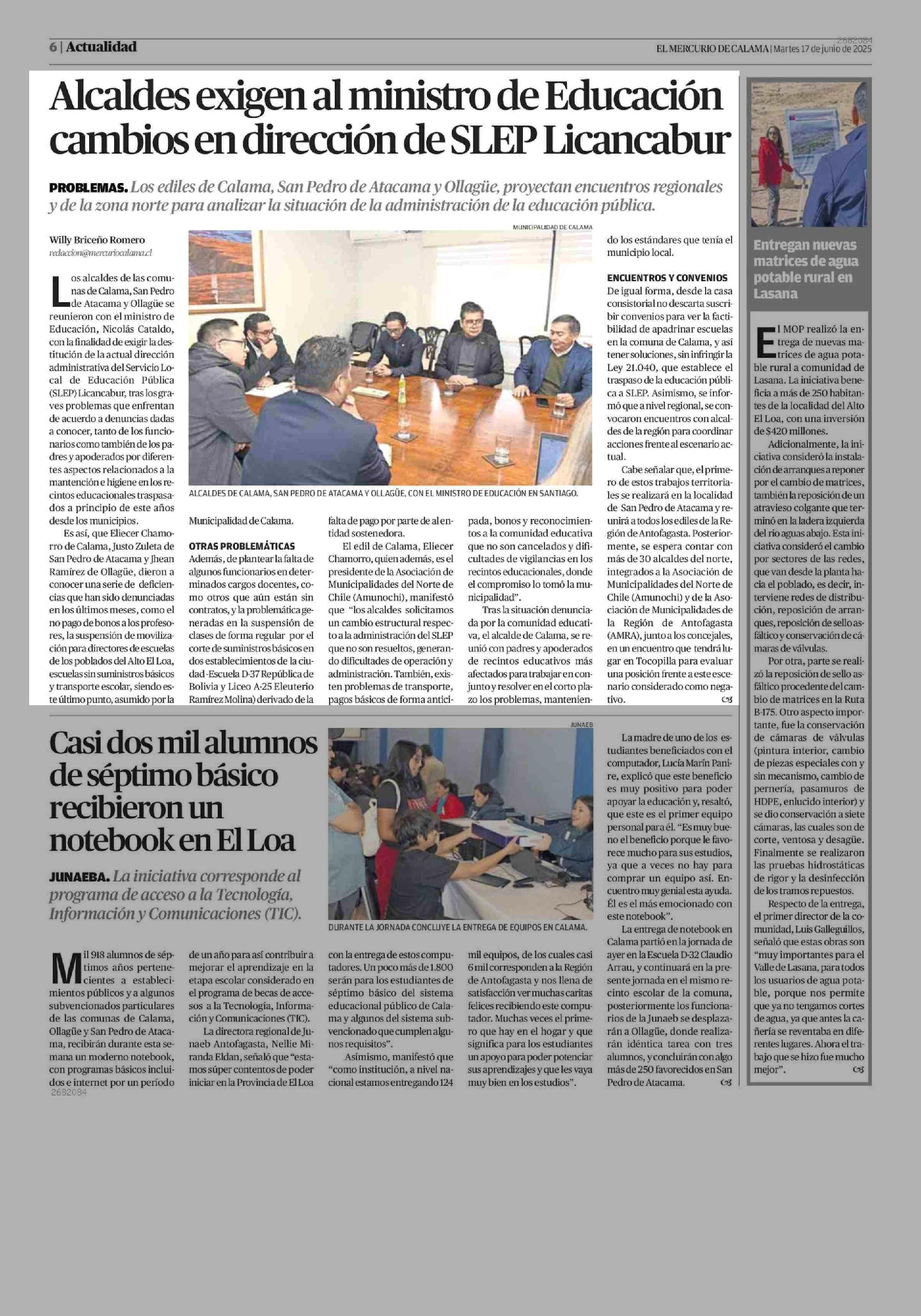 Alcaldes exigen al ministro de Educación cambios en dirección de SLEP Licancabur 17-06-2025 El Mercurio de Calama |