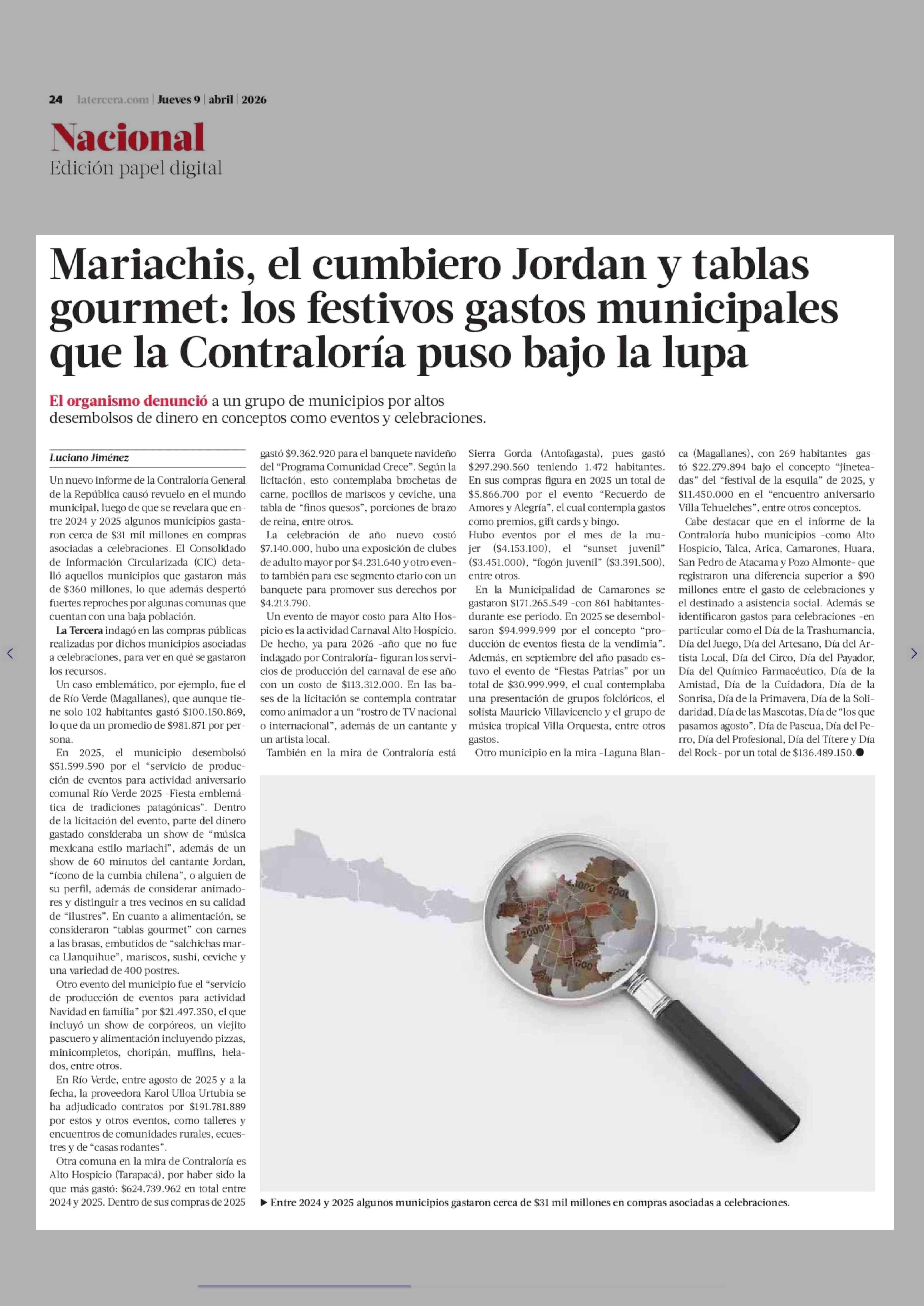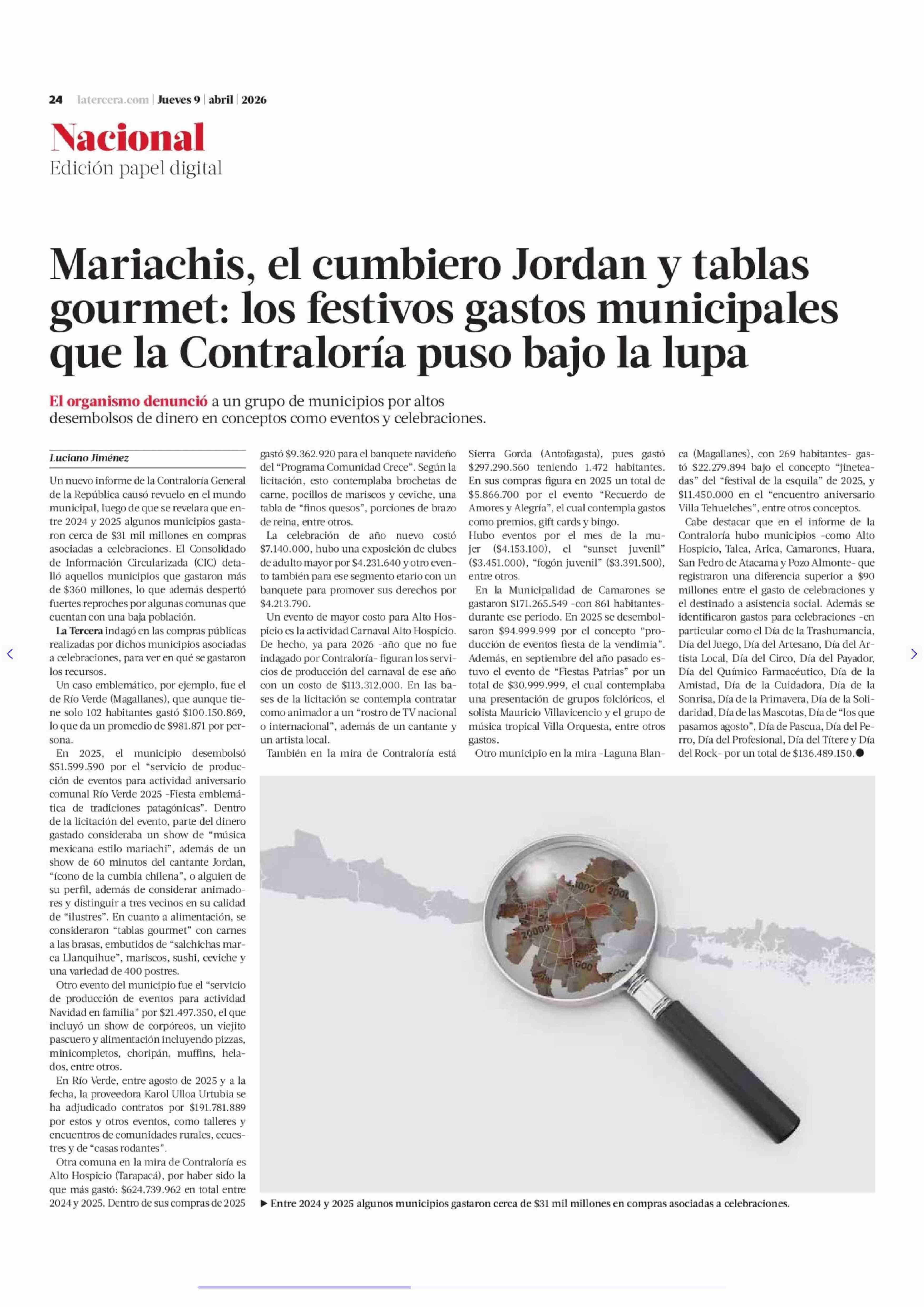 Mariachis, el cumbiero Jordan y tablas gourmet: los festivos gastos municipales que la Contraloría puso bajo la lupa 09-04-2026 La Tercera |