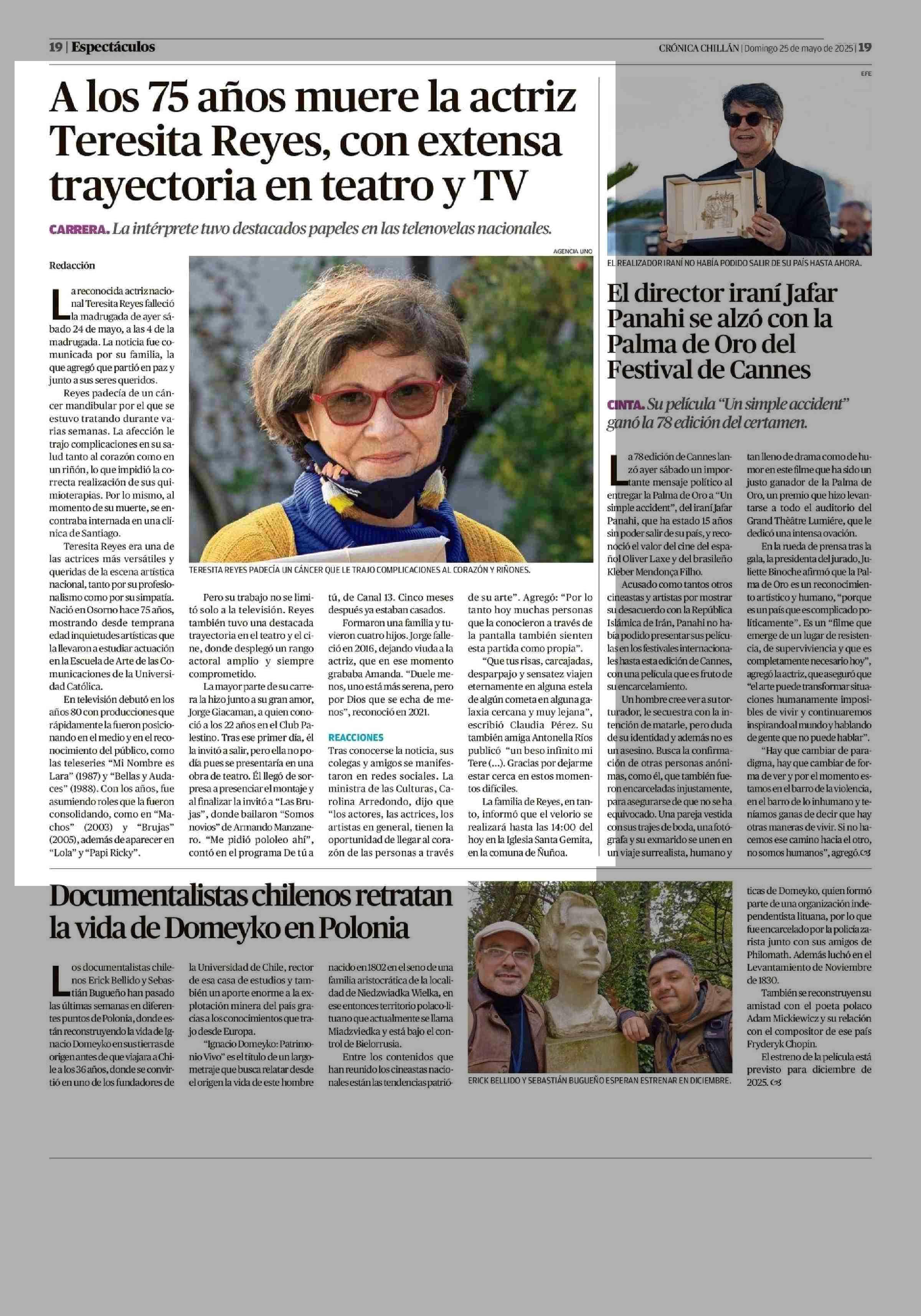 A los 75 años muere la actriz Teresita Reyes, con extensa trayectoria en teatro y TV 25-05-2025 Crónica de Chillán |