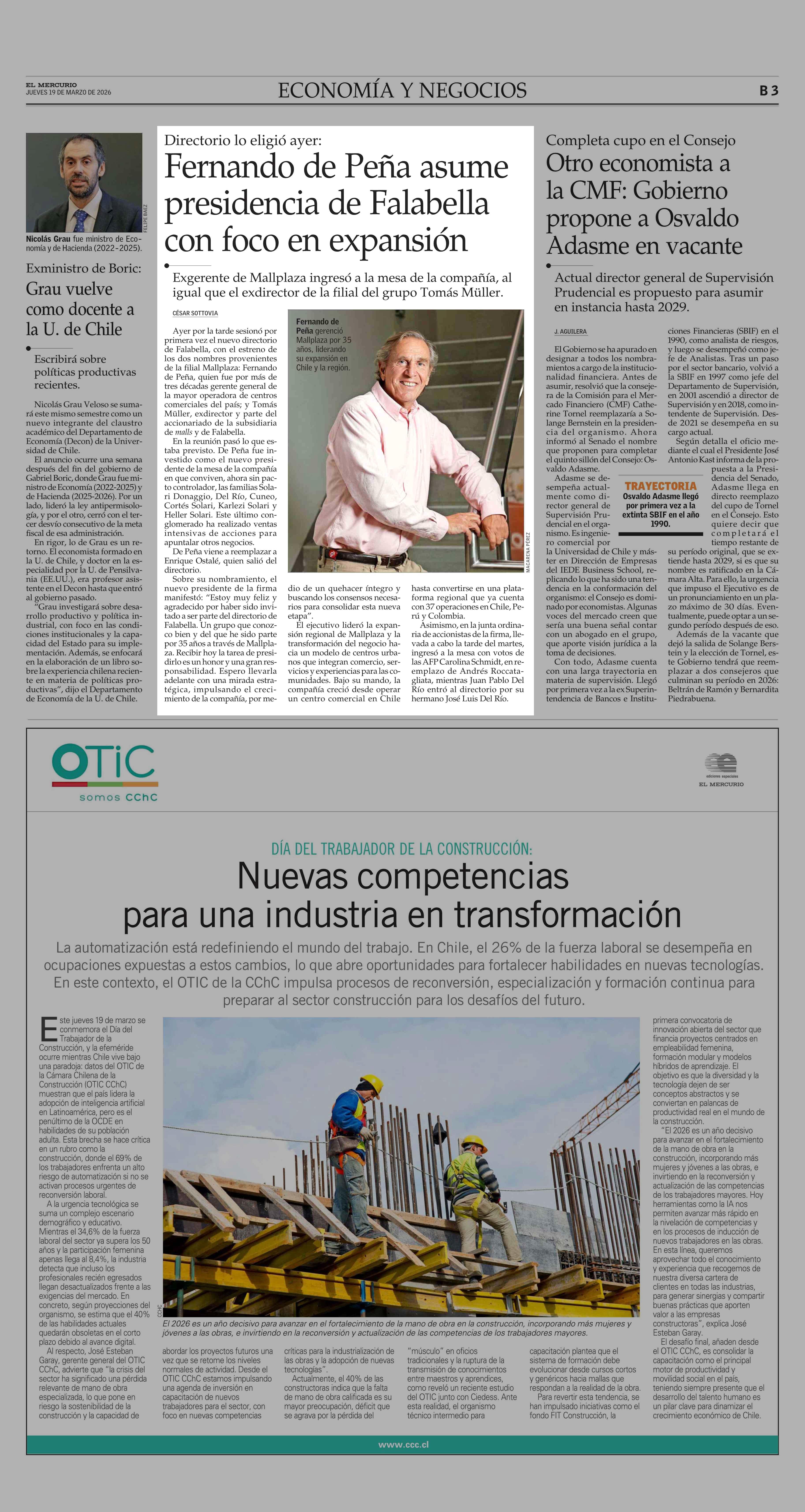Fernando de Peña asume presidencia de Falabella con foco en expansión 19-03-2026 El Mercurio |