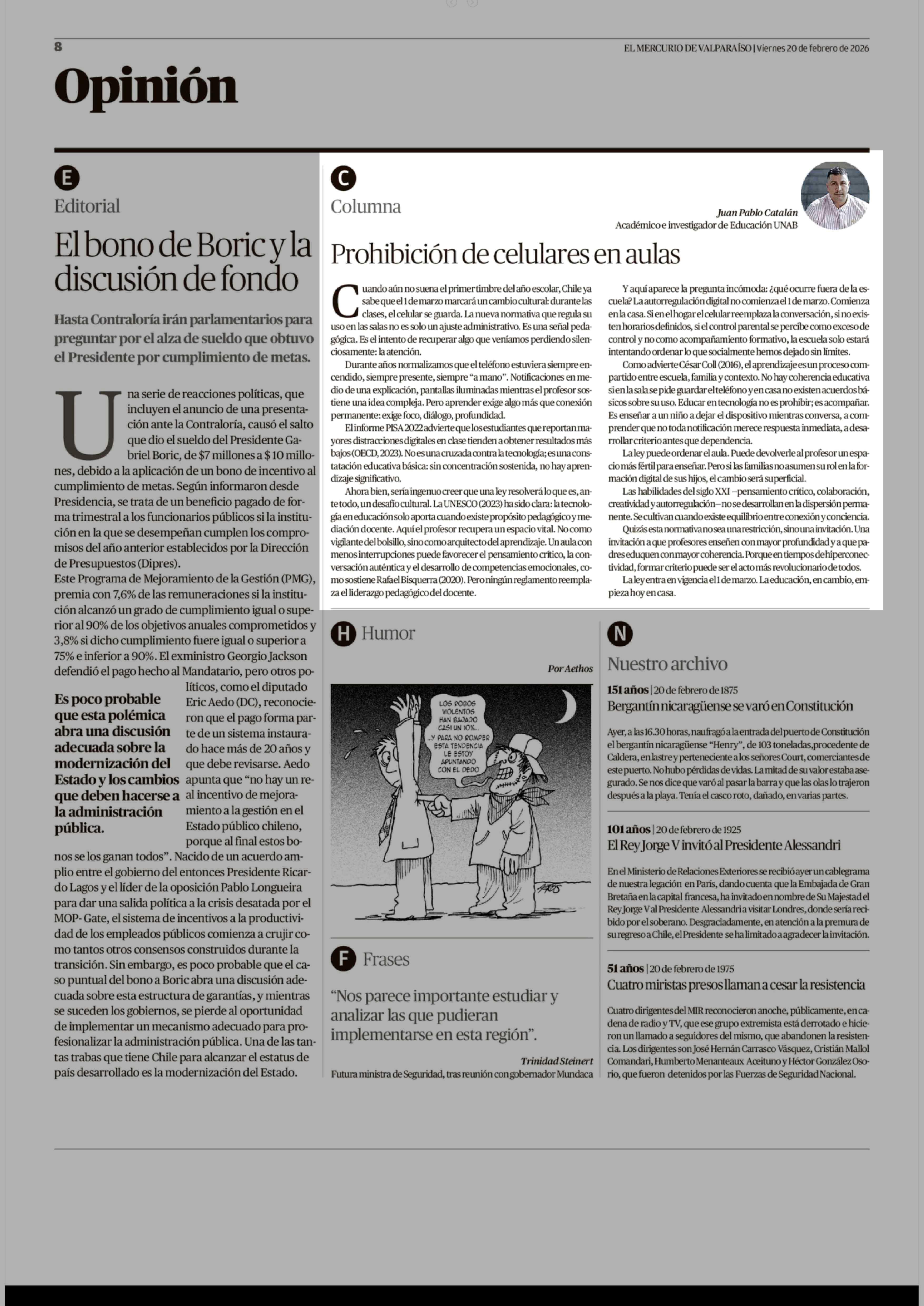Columnas de Opinión: Prohibición de celulares en aulas 20-02-2026 El Mercurio de Valparaíso |