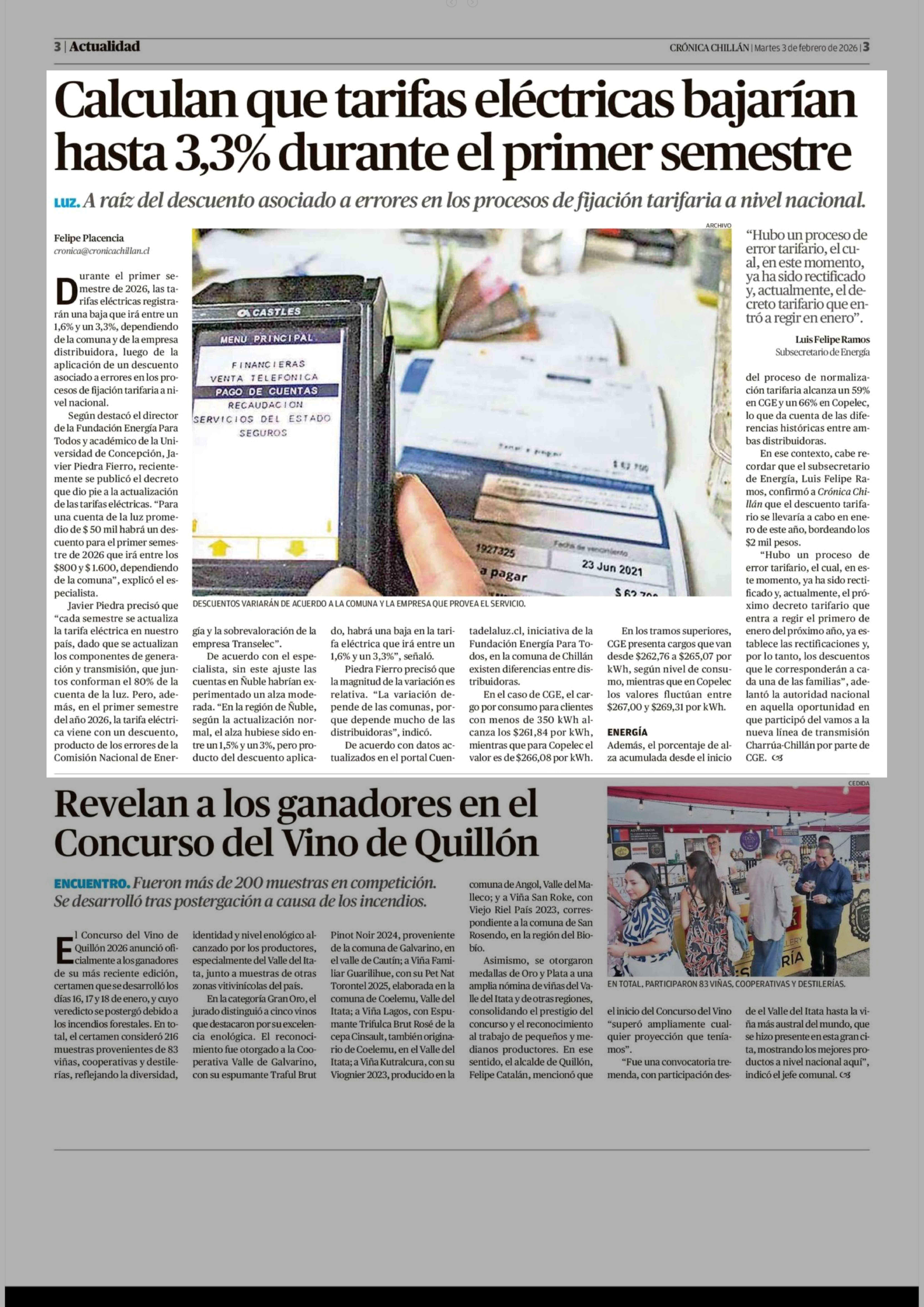 Calculan que tarifas eléctricas bajarían hasta 3,3% durante el primer semestre 03-02-2026 Crónica de Chillán |