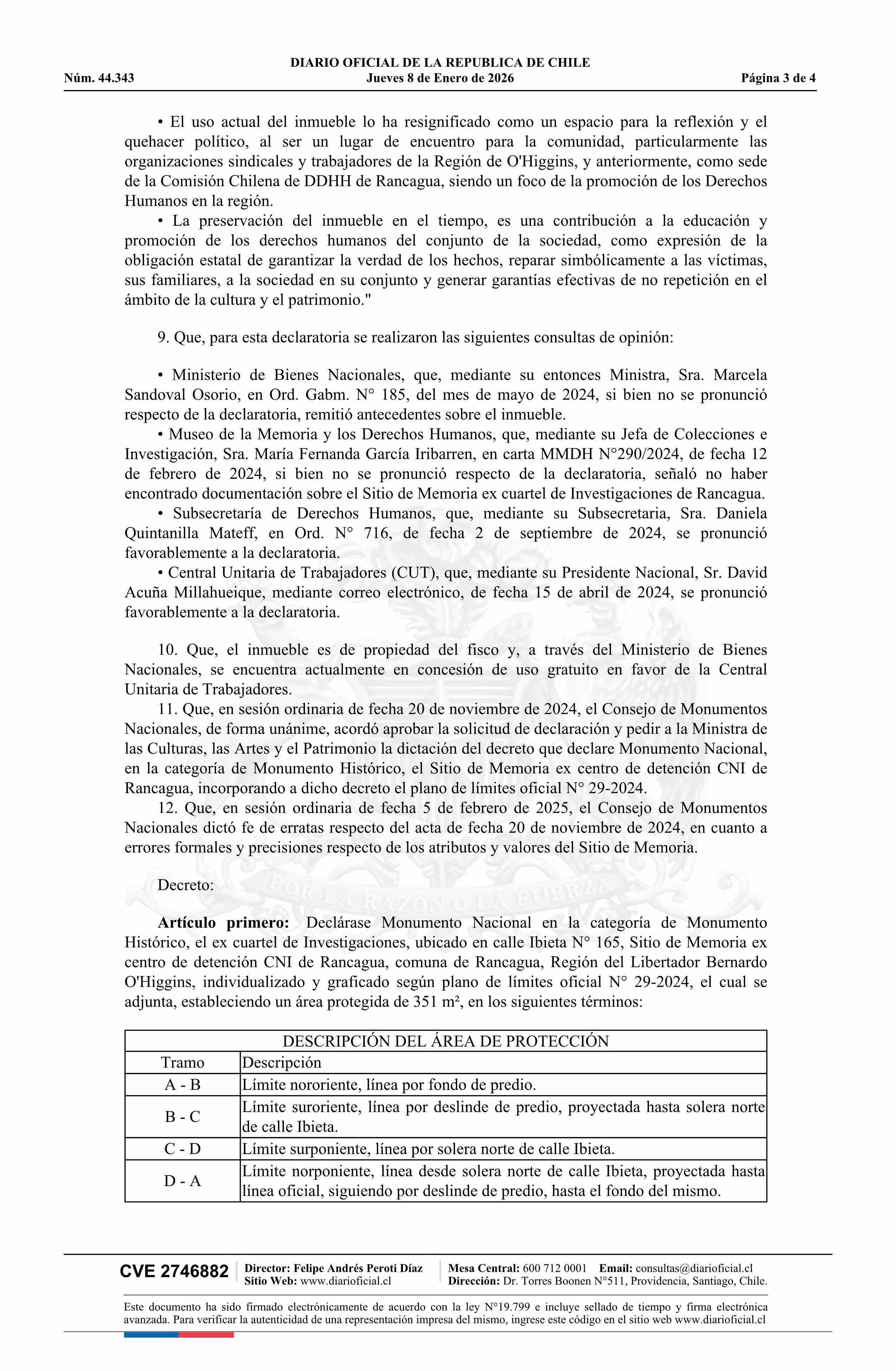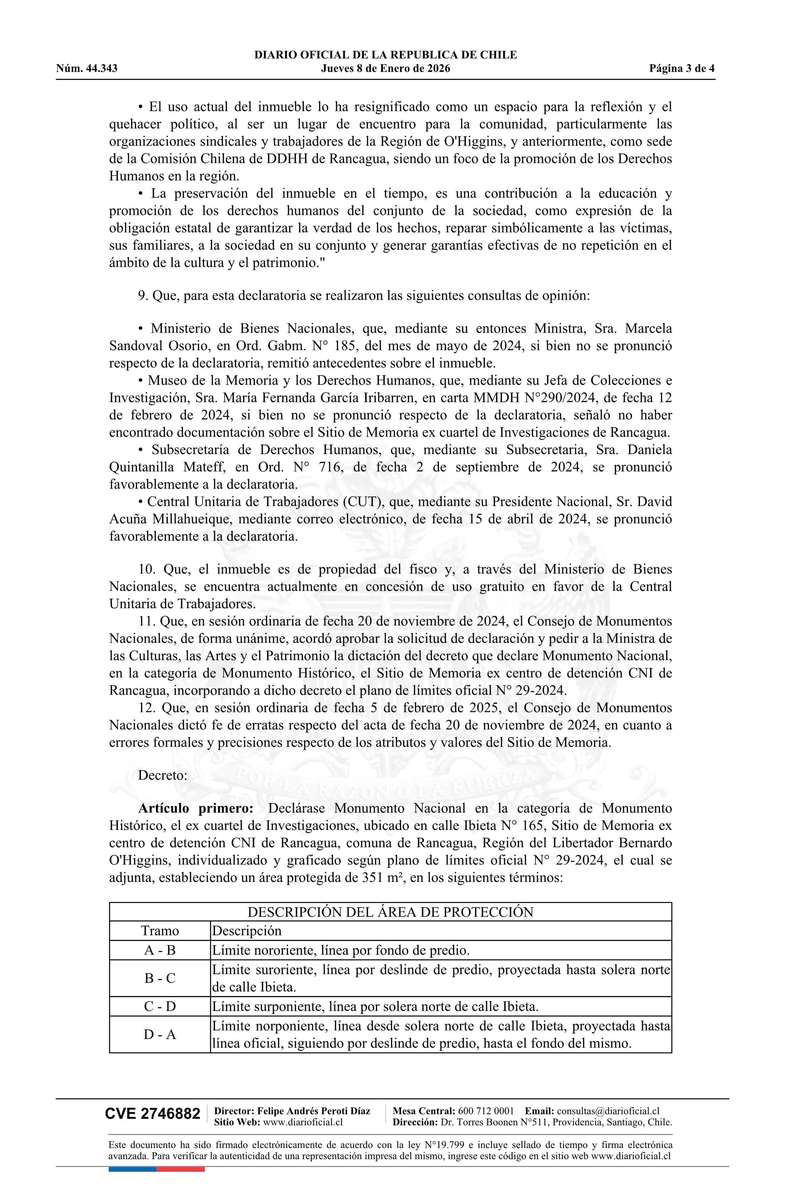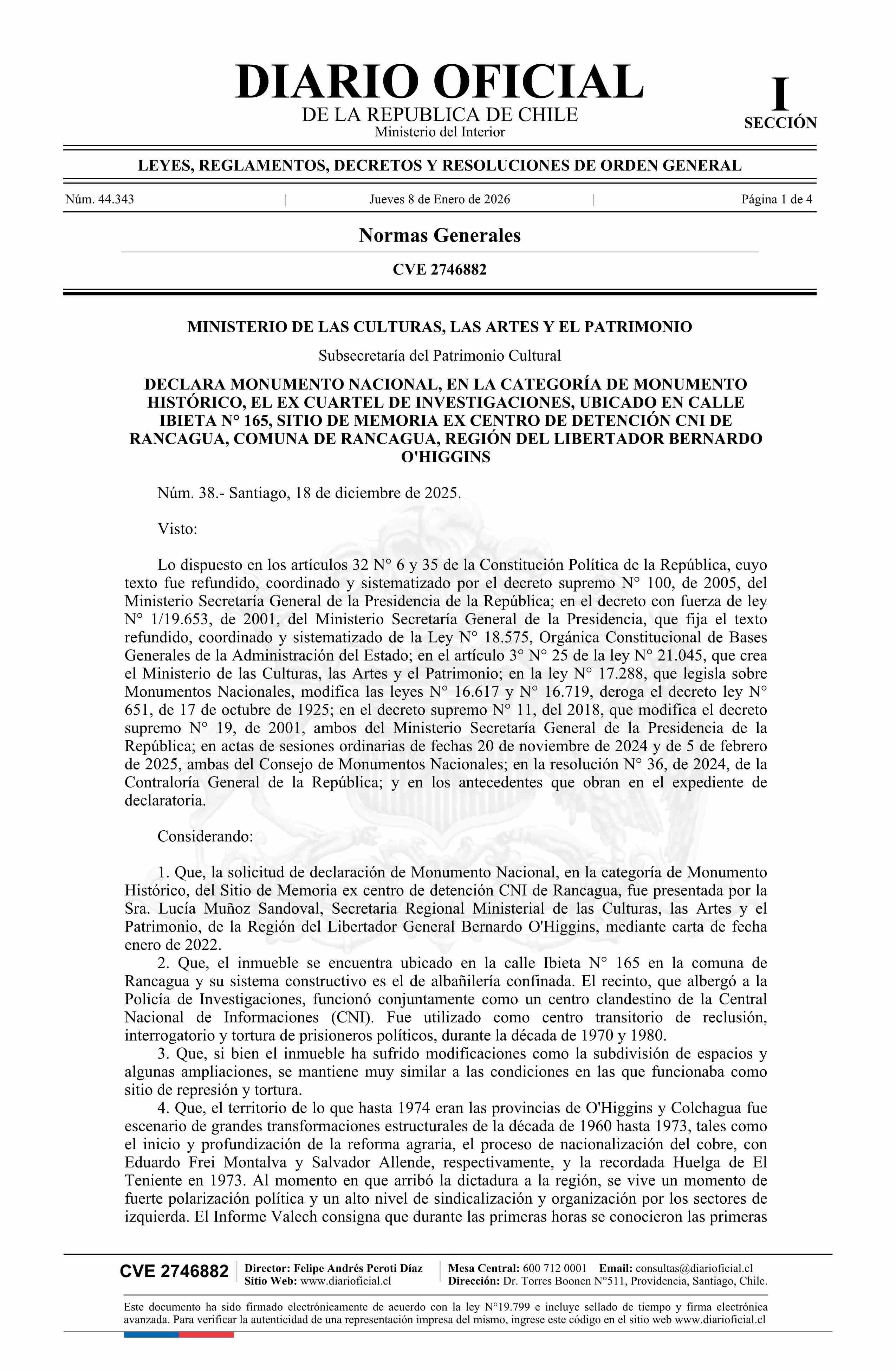 | Título: | Decreto número 38, de 2025.- Declara Monumento Nacional, en la categoría de Monumento Histórico, el ex Cuartel de Investigaciones, ubicado en calle Ibieta N° 165, Sitio de Memoria Ex Centro de Detención CNI de Rancagua, comuna de Rancagua, Región del Libertador General Bernardo O'Higgins |
