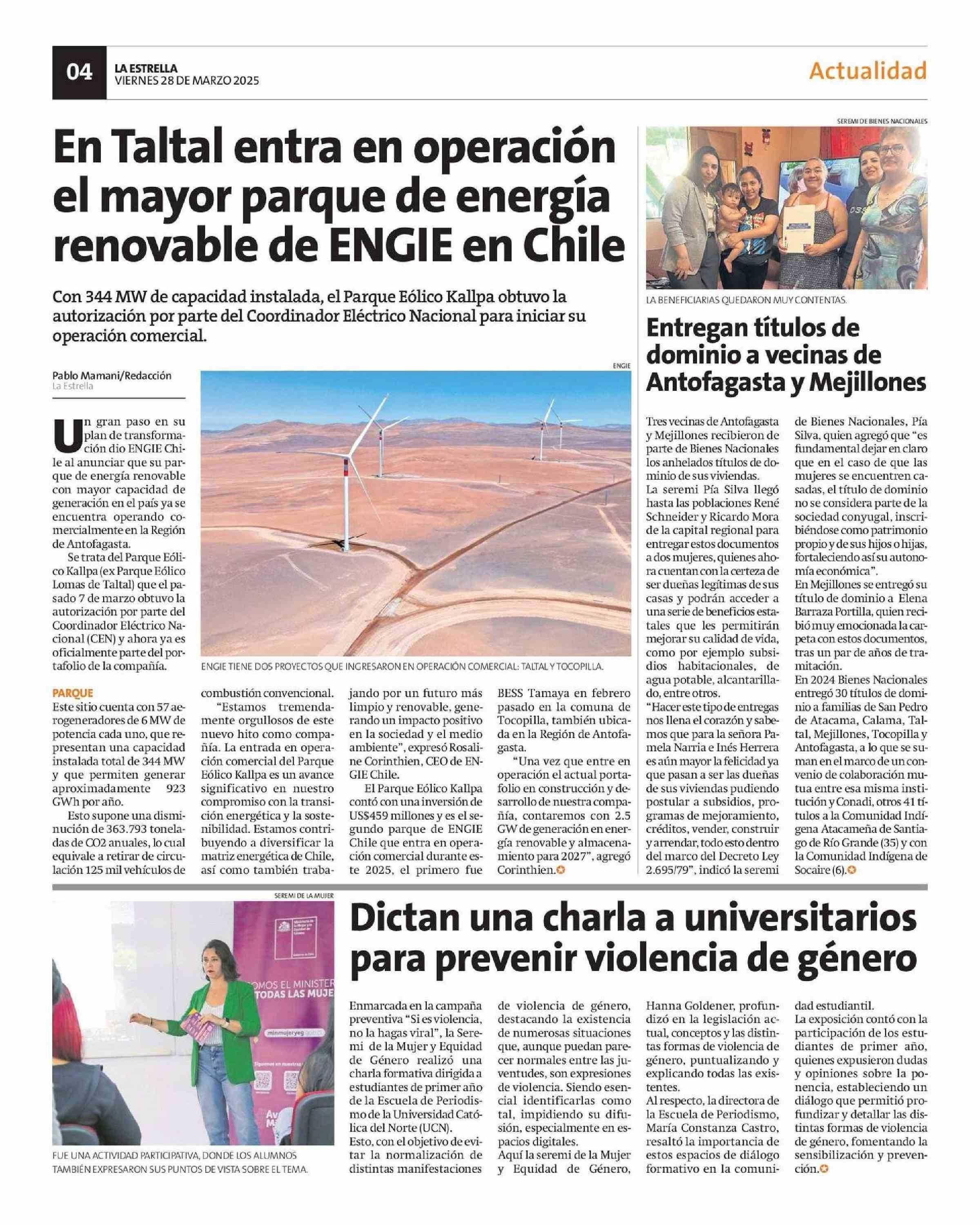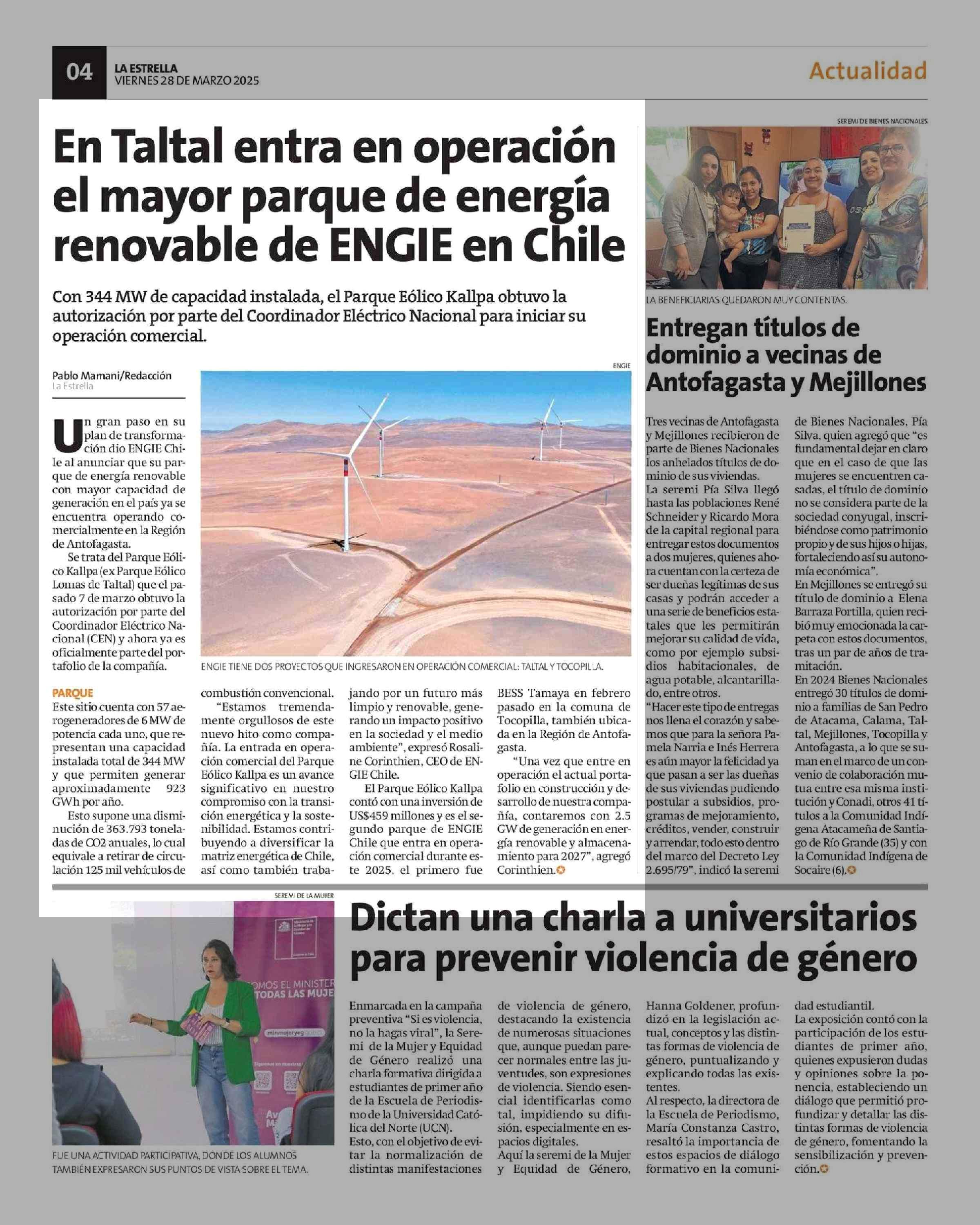 En Taltal entra en operación el mayor parque de energía renovable de ENGIE en Chile 28-03-2025 La Estrella de Tocopilla |